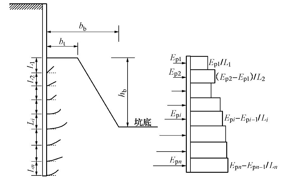 The passive earth pressure should be known for the design of the berm-retained excavation, but no reasonable method for calculating the passive earth pressure has been found until now. According to the characteristics of the berm-retained excavation, the upper bound method based on the limit analysis theory is used to analyze the passive earth pressure provided by the passive soil area. To use the upper bound method, the vertical slice blocks are used to separate the passive soil area of the berm-retained excavation, and a compatible speed field is constructed. The optimization analysis technology is used to obtain the minimum upper bound solution. In order to test the rationality of the proposed upper bound solution, the passive earth pressures with different wall heights, geological parameters and other conditions are calculated by the proposed upper bound method, and the values and failure envelops are compared with the classical Rankine’s solutions. By employing the proposed upper bound method, the value of the passive earth pressure, the distribution of the passive earth pressure along the retaining wall, the failure envelops of passive soil area are studied under different parameters such as the berm top width, berm bottom width, berm height and berm slope coefficient. The influences of these parameters on the passive earth pressure and the failure envelops are discussed. The proposed method may lay the foundation for the design and optimization design of the berm-retained excavation in the future.
