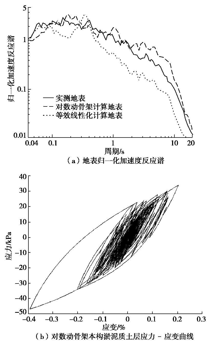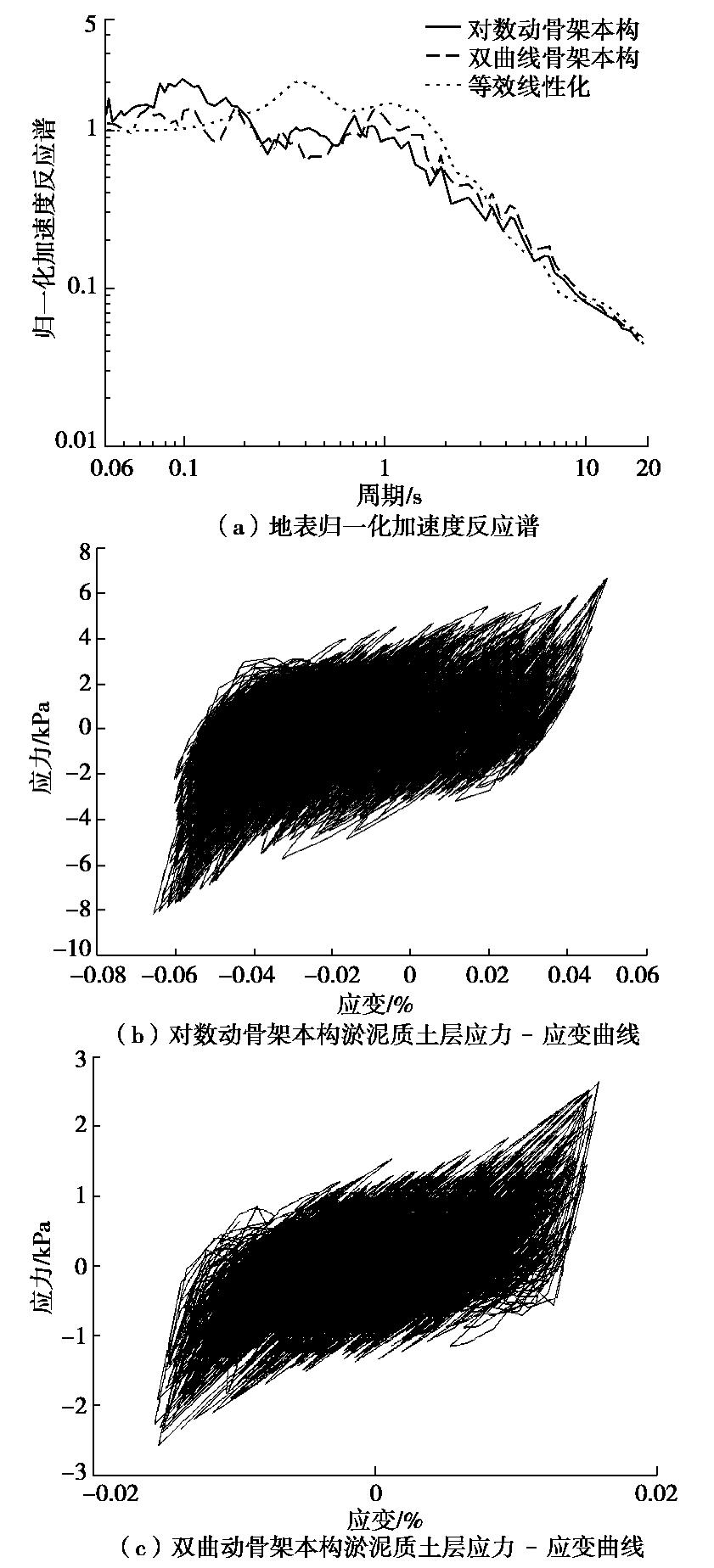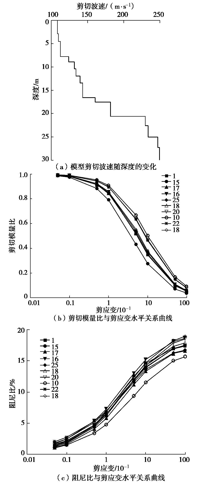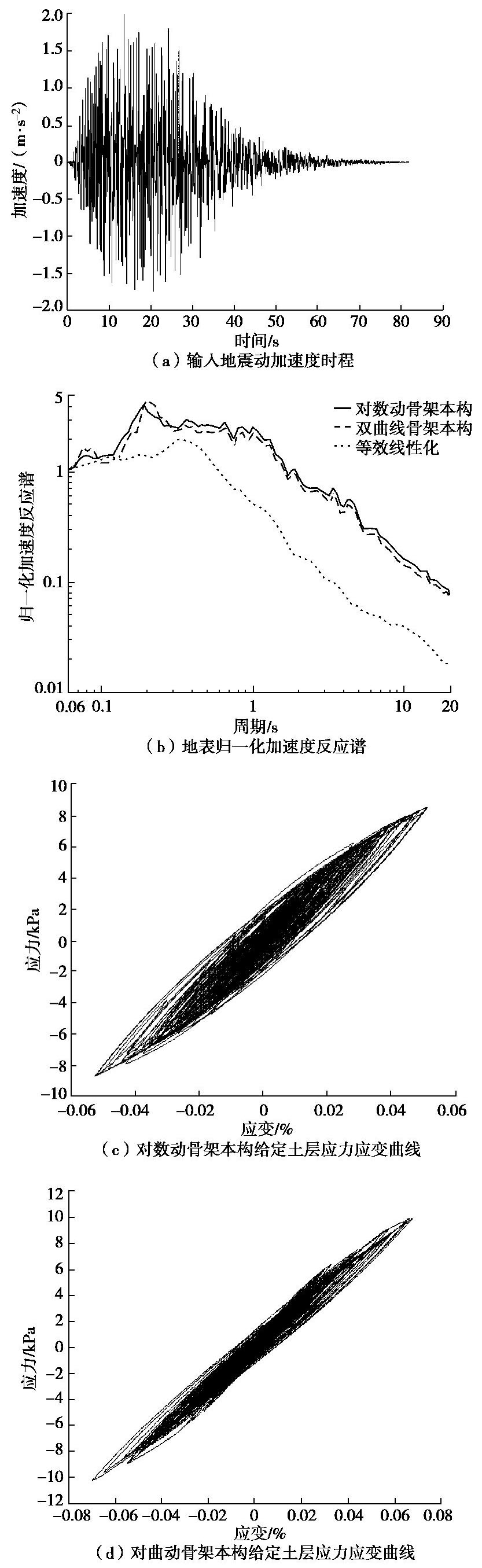 试验曲线确定的对数骨架曲线的函数表达式,其特点是渐近线上升较缓慢。基于Mashing准则,以加卸载转折点应力应变为参考应力应变点建立了对数动骨架曲线本构函数表达式。在此基础上,提出了基于对数动骨架曲线土体本构的交叠差分格式一维土层时域非线性地震反应分析方法,并以Microsoft Visual C++ 6.0为开发平台,自行编制了一维土层地震反应分析程序Soilresp1D,开展了于软弱土层、薄覆盖层场地和场地影响台阵场地的时域非线性地震反应计算分析。与基于双曲动骨架曲线本构的时域分析结果、等效线性化分析结果以及实际地震动观测记录对比,展现了提出的对数动骨架曲线本构的可行性及合理性。同时,对比结果表明,基于对数动骨架曲线本构的土层时域非线性地震反应分析方法适用于不同类型场地的地震反应分析,且尤其表现为对数动骨架曲线本构滞回圈较宽、阻尼比退化系数较大,更好地体现了实际土体的非线性和塑性特性。 Abstract: The equivalent linearization method for seismic nonlinear response of soils will overestimate its high-and low-frequency nonlinear effects, and the plastic deformation of soils can not be reflected, especially for soft soil layer sites and thin overburden sites. The functional expression for logarithmic skeleton curves is proposed based on the test curves to analyze the time-domain nonlinear seismic responses, and the characteristic of the new skeleton curve is that the asymptote rises slowly. Based on the Mashing criterion, a logarithmic dynamic skeleton constitutive model is established with loading-unloading turning points as reference points. On this basis, a 1D time-domain seismic response method for soil by using the overlapping difference scheme is proposed. The corresponding program Soilresp1D is developed taking Microsoft Visual C++ 6.0 as the platform, and it is used to analyze the nonlinear seismic response of soft-soil layer sites and thin overburden sites and Eureka Canyon Road site. By comparing with the results of time-domain analysis based on the hyperbolic dynamic skeleton constitutive model, the equivalent linearization analysis and the actual seismic response observation, the feasibility and rationality of the proposed logarithmic dynamic skeleton curve are verified. The results show that the nonlinear seismic response method based on the logarithmic dynamic skeleton constitutive model can be applied to the seismic response analysis of different soil-layer sites. It is especially shown that the area of the hysteresis loop of the logarithmic dynamic skeleton curve and the damping degradation coefficient are larger, thus the damping effect and the plastic property of soils are better reflected.