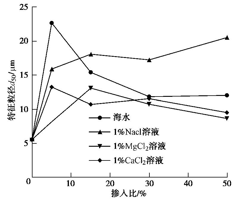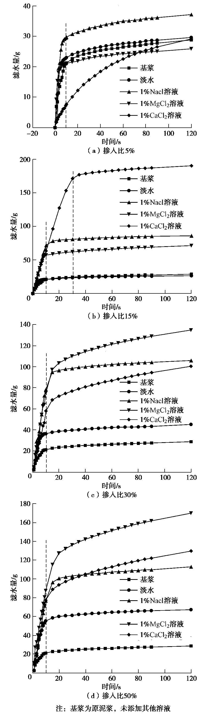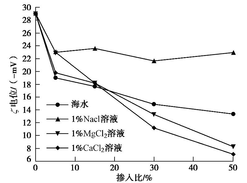 In view of the problem that the high-salinity stratum intrusion during construction of submarine tunnels by the slurry shield will lead to the decrease of the stability of slurry, this study aims to investigate the effects of different salt solutions on the stability of slurry via colloidal flocculation mechanism by adding salt solutions into slurry and testing change of the parameters such as bleeding rate, zeta potential, characteristic particle sizes and seepage discharge of the slurry. The results show that compared with that by adding fresh water, the slurry by adding 1% salt solution in which the quality of water is 15 times that of bentonite, the zeta potential of slurry decreases, and its characteristic particle sizes and seepage discharge increase. The salt solution affects the stability of slurry mainly by decreasing its zeta potential, which promotes slurry particles to flocculate and to dilute the slurry. When the mixing ratio is more than 5% and keeps to increase, if the salt solution is NaCl, the zeta potential changes a little and then keeps steady, and the characteristic particle size d