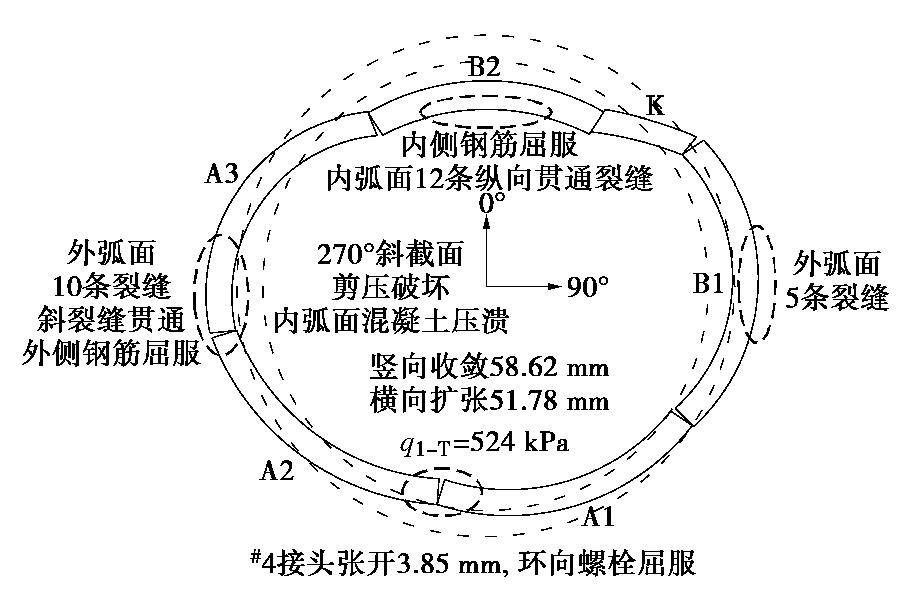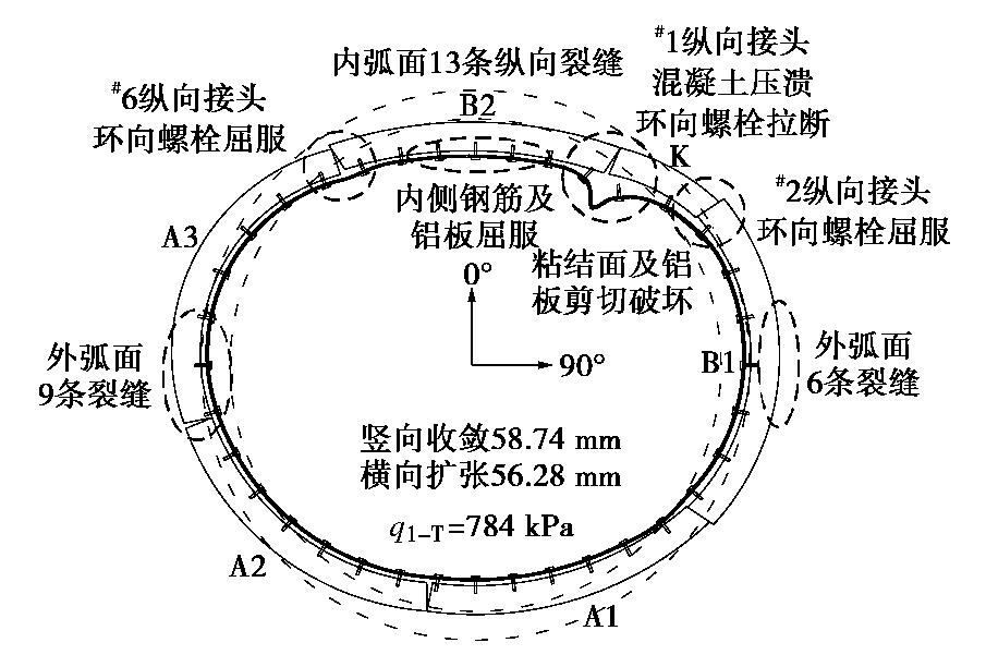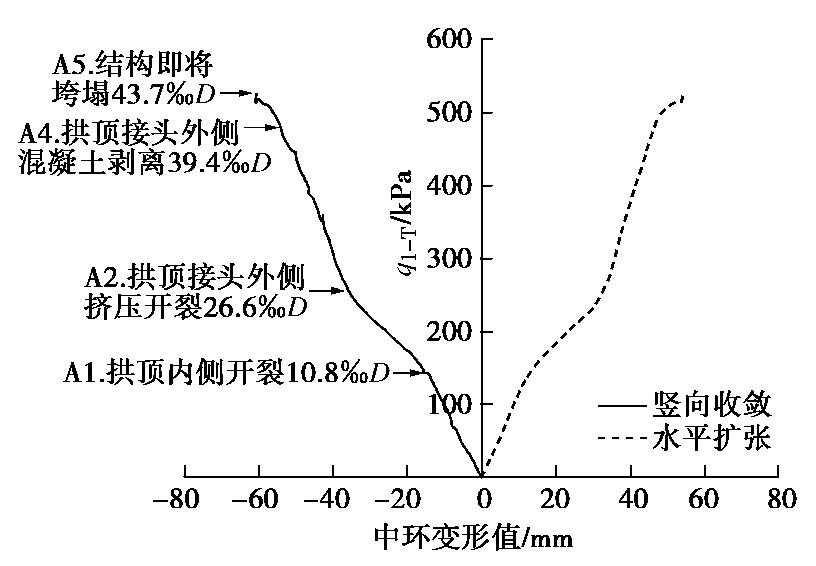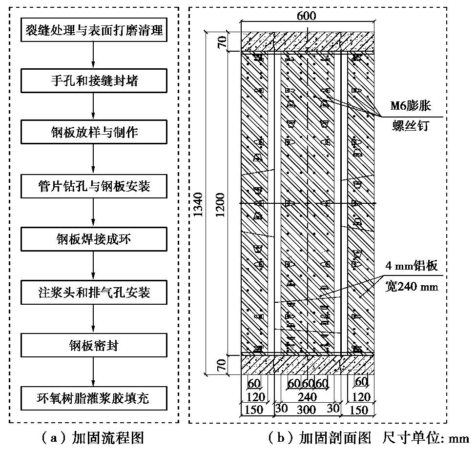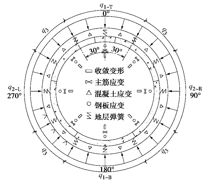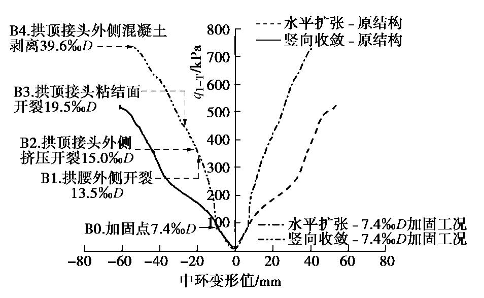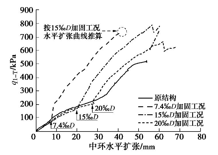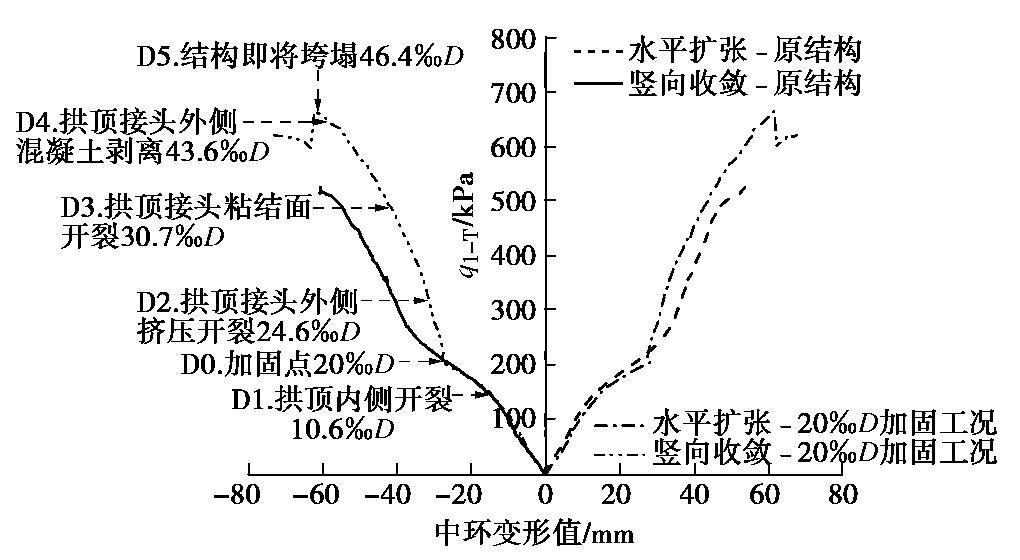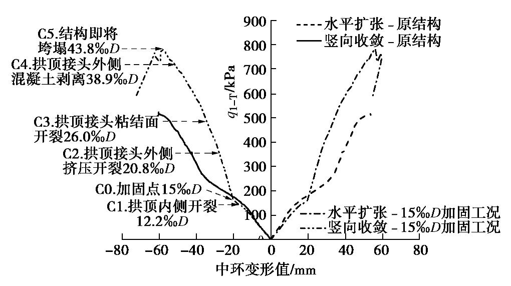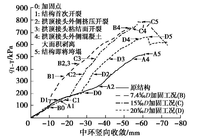 D is the outer diameter of the tunnel), the bonded steel plate reinforcement is adopted for the tunnel structure. Compared with the original structure, the failure loads of the structure reinforced by the bonded steel plates increase by 54.2%, 49.6% and 26.7% respectively, the vertical deformation at structural instability is 60.78, 58.74 and 62.15 mm respectively, and the horizontal deformation at structural instability is 48.46, 56.28 and 61.68 mm respectively, indicating that the bonded steel plate reinforcement can improve the structural bearing capacity, and it has no great influence on the unstable displacement, thus providing a basis for judging the structural service performance based on the displacement change. (2) It is more reasonable to use as the reinforcement time when the structural deformation is between 10‰