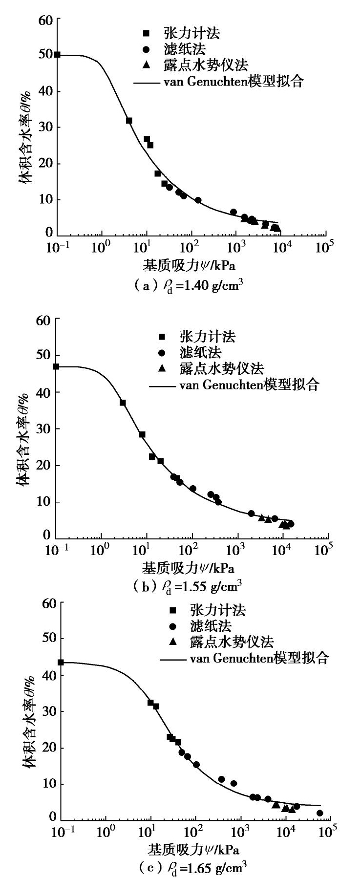 摘要: 针对取自浩吉铁路阳城隧道的砂质黄土土样,采用张力计法、滤纸法和露点水势仪(WP4C)法,得到了宽广吸力范围内不同干密度砂质黄土的土-水特征曲线(SWCC)。采用van Genuchten模型对SWCC试验结果进行拟合,确定其进气值。基于扫描电镜试验,对不同干密度和含水率砂质黄土的微观孔隙结构进行了观测,从宏微观角度分析了不同干密度土样SWCC的初始饱和含水率、失水速率以及进气值的变化规律。试验结果表明:砂质黄土的体积含水率随基质吸力的增加逐渐减小;随着干密度增加,土体内部的孔隙结构由较多的架空孔隙转化为较均匀的中等孔隙,初始饱和含水率和失水速率逐渐降低,进气值逐渐增大。Abstract: A series of laboratory tests are conducted on sandy loess taken from Yangcheng Tunnel of Haoji Railway under different dry densities by the combination of tensiometer method, filter paper method, and dew point hydro potential meter (WP4C) method. The soil-water characteristic curve (SWCC) of sandy loess in a wide suction range is obtained, and the effect of the initial dry density is emphatically studied. The van Genuchten model is used to fit the SWCC test results under different dry densities and the air entry value of the SWCC is determined. The microscopic pore structure of sandy loess with different dry densities and water contents is studied by scanning electron microscope tests. The change rules of the initial saturated water content, water loss rate and air entry value of SWCC under different dry densities are observated from a macro-micro perspective. The test results show that the volumetric water content of sandy loess decreases with the increase of matric suction, and the pore structure of soil changes from more overhead pores to more uniform medium pores with the increase of dry density. The initial saturated water content and water loss rate gradually decrease, and the air entry value gradually increases.