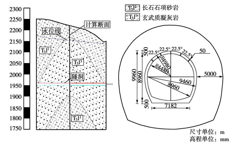 摘要: 目前计算外水压力的理论公式大多针对均质围岩,当地层中存在强隔水层时,计算结果较实际压力偏大较多,导致出现衬砌结构厚度大、工程超预算等问题。为使衬砌结构设计与参数选取更为经济合理,结合滇中引水工程大理Ⅱ段深埋长引水隧洞,采用数值模拟的方法,选取衬砌外表面3个特征点,通过对上覆岩层中隔水层的位置高度、厚度以及与围岩的相对渗透性开展敏感性分析,对衬砌外水压力变化规律进行了研究。结果表明:衬砌外水压力随着隔水层位置高度的增加而减小,但是变化不显著;隔水层厚度是影响衬砌外水压力的关键因素,衬砌外水压力随着隔水层厚度的增加而显著减小;衬砌外水压力随着围岩与隔水层渗透系数比值的增大而减小,衬砌外水压力对相对渗透性非常敏感,当相对渗透性增大到200以上时,隔水层承担了绝大部分水头压力,衬砌外水压力降低到一定程度并逐渐稳定下来。研究结果可为地层中含有隔水层的深埋长隧洞的衬砌设计提供借鉴和参考。Abstract: At present, the theoretical formulas for calculating the external water pressures are mostly for homogeneous surrounding rocks. When there is a strong aquiclude in stratum, the calculated results are larger than the actual pressures, which will lead to the problems of large thickness of lining structures and overestimation of project budget. In order to make the design of lining structures and selection of parameters more reasonable and economical, combined with the deep-buried long diversion tunnel of Dali Section II of Middle Yunnan Water Diversion Project, by using the numerical simulation method and selecting three characteristic points on the outer surface of the linings, the sensitivity analysis of the position height and thickness of the aquiclude in overlying strata and the relative permeability of surrounding rocks are performed, and the variation laws of the external water pressures on linings are investigated. The results show that the external water pressures on the linings decrease with the increase of the height of the aquiclude, but the change is not significant. The thickness of the aquiclude is the key factor affecting the external water pressures on the linings, and the external water pressures on the linings decrease significantly with the increase of the thickness of the aquiclude. The external water pressures on the linings increase with the ratio of the surrounding rocks to the permeability coefficient of the aquiclude. When the relative permeability increases to a certain value, the aquiclude bears most of the head pressures, and the external water pressures on the linings decrease to a certain extent and gradually stabilize. The research results may provide reference for lining design of deep-buried long tunnels with aquicludes in strata.