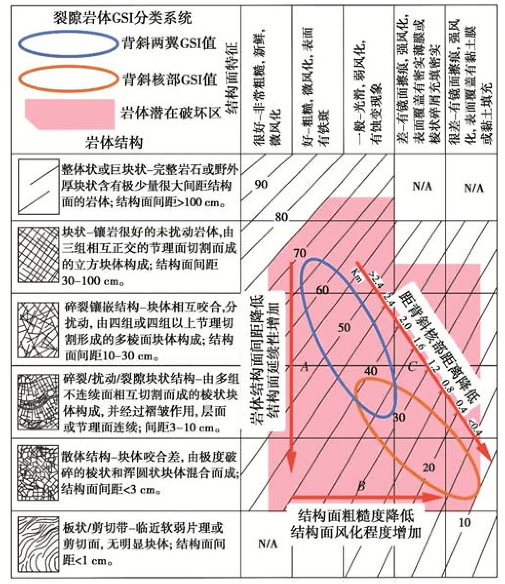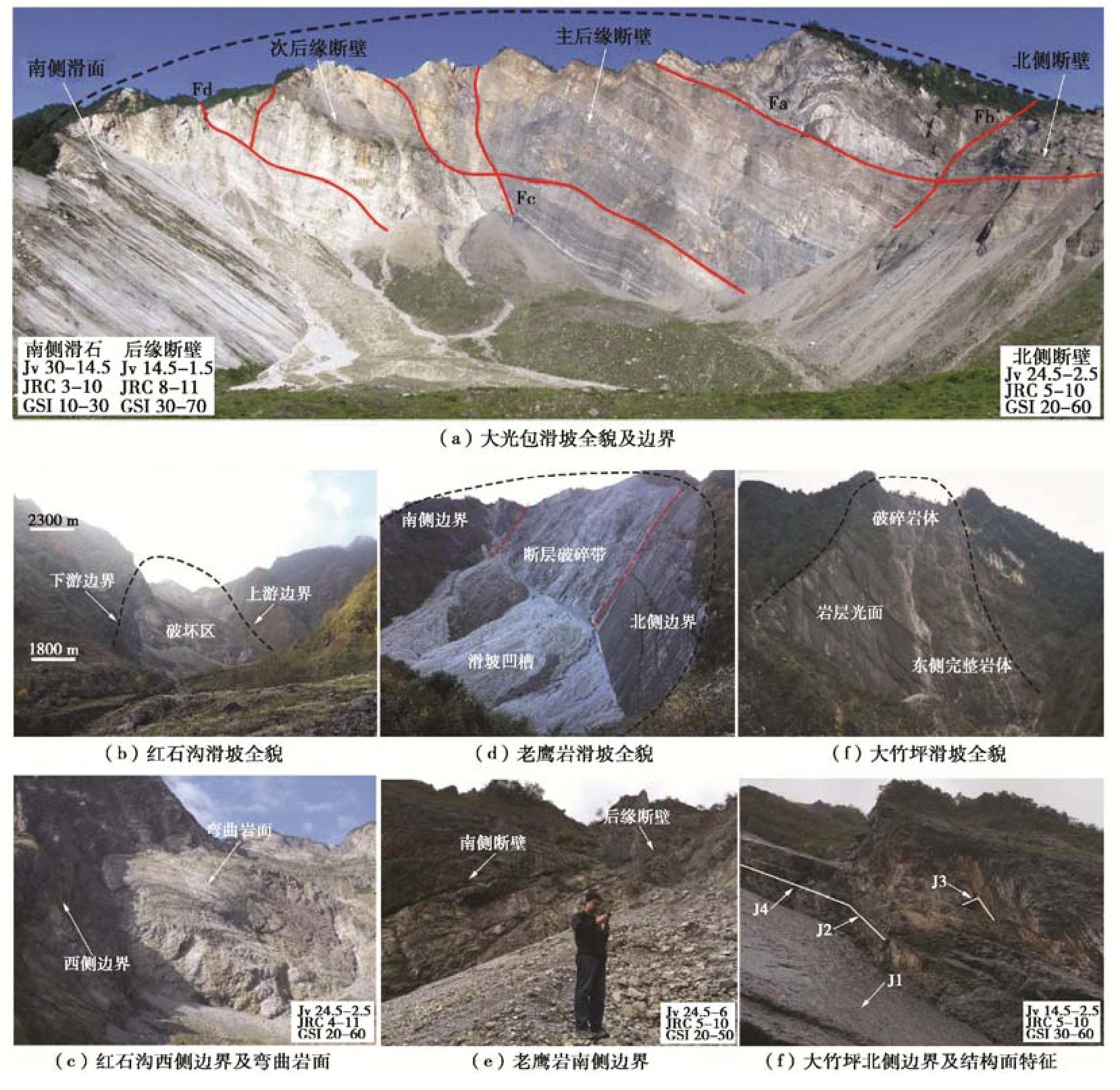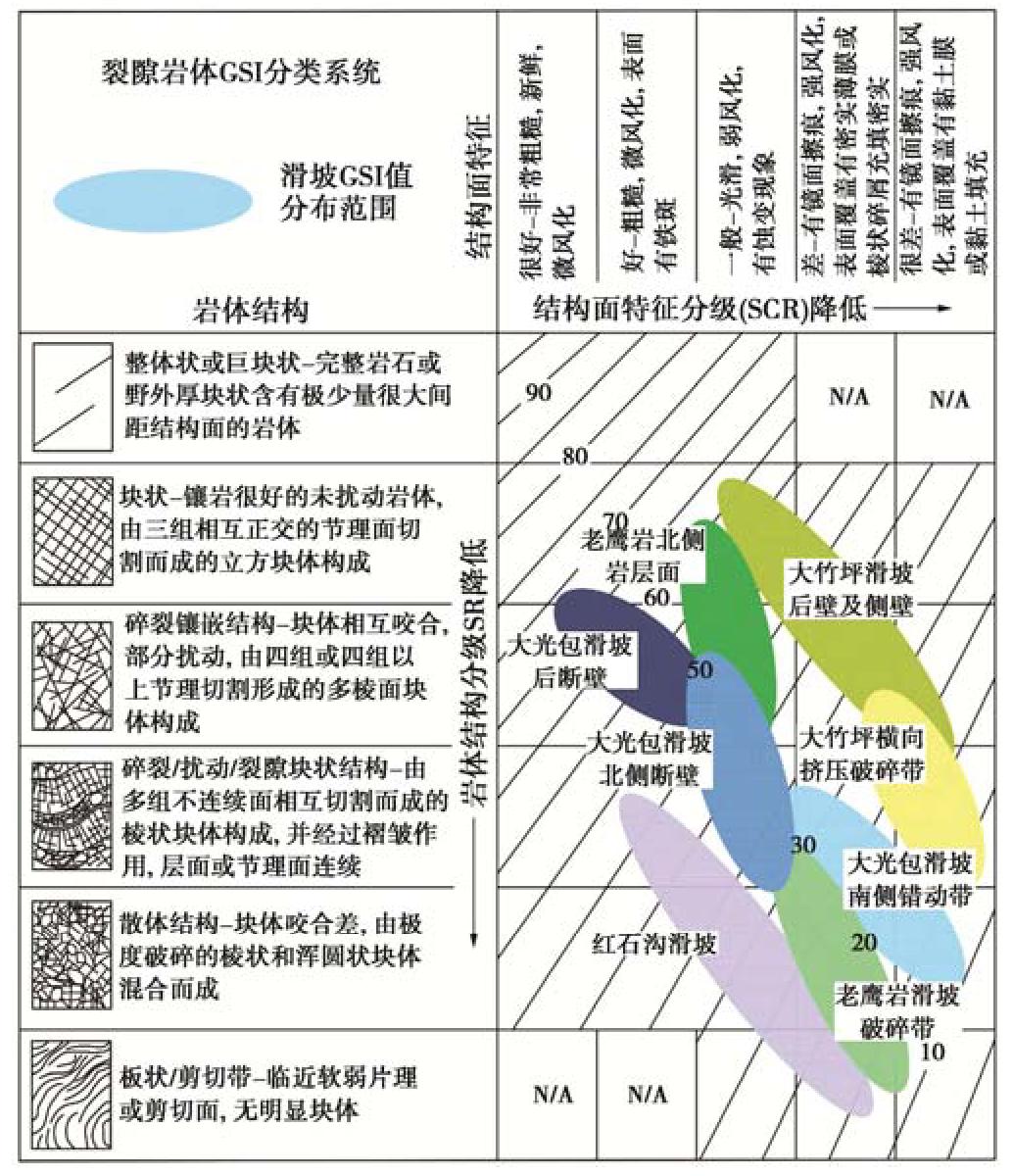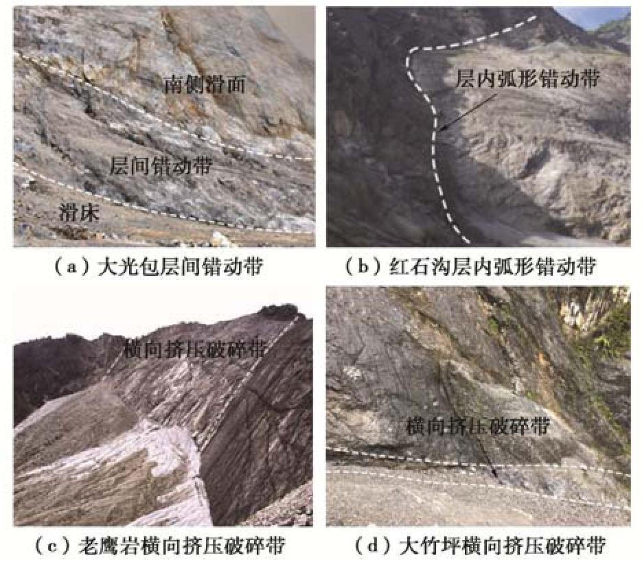Rock landslides are generally controlled by a series of discontinuities that relate to faults, folds and shear zones, which provide potential failure boundaries. To study the influences of rock mass damage and discontinuous geological interface on the formation and initiation of landslides under the background of fault and anticline, four large landslides triggered by the Wenchuan Ms8.0 earthquake in the carbonate strata of two wings of Dashuizha anticline are selected as examples to carry out detailed engineering geological investigation, structural plane survey, rock testing and rock quality assessment of GSI. The results show that there are clear differences in structural damage caused by fault and anticline. Gradually, the rock mass quality increases from the axis of anticline to the two wings, only decreases significantly locally, and controls the formation position of landslides. Meanwhile, under the background of structural damage, the structural plane and weak zone of specific rock jointly determine the initiation mechanism, and the types are summarized as "control side sliding type", "control bottom sliding type", "control sliding body type" and "control base type". In addition, the comparison of GSI of seismic and non-seismic landslides reveals that strong earthquake may promote the rapid start of landslides by reducing the rock mass quality, and then accelerate the process of geomorphic erosion in the structural damage area. Finally, it is believed that considering the rock mass damage in complex tectonic environment is very important to assess the location and initiation mechanism of potential large-scale landslides caused by strong earthquakes.
