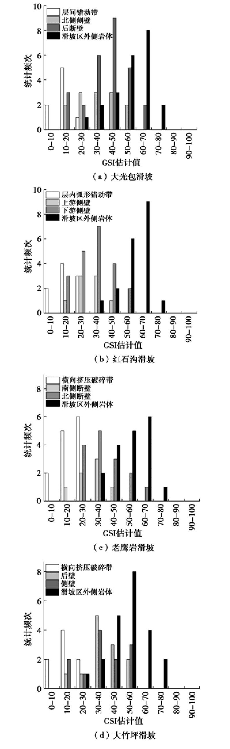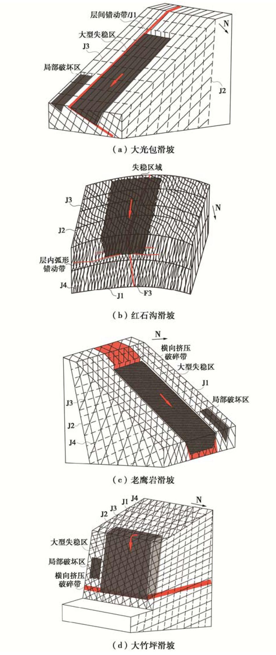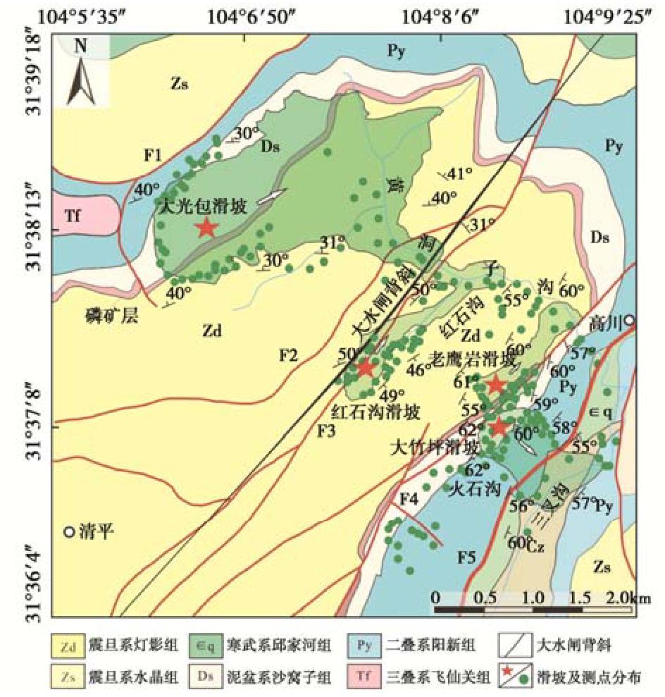 Rock landslides are generally controlled by a series of discontinuities that relate to faults, folds and shear zones, which provide potential failure boundaries. To study the influences of rock mass damage and discontinuous geological interface on the formation and initiation of landslides under the background of fault and anticline, four large landslides triggered by the Wenchuan Ms8.0 earthquake in the carbonate strata of two wings of Dashuizha anticline are selected as examples to carry out detailed engineering geological investigation, structural plane survey, rock testing and rock quality assessment of GSI. The results show that there are clear differences in structural damage caused by fault and anticline. Gradually, the rock mass quality increases from the axis of anticline to the two wings, only decreases significantly locally, and controls the formation position of landslides. Meanwhile, under the background of structural damage, the structural plane and weak zone of specific rock jointly determine the initiation mechanism, and the types are summarized as "control side sliding type", "control bottom sliding type", "control sliding body type" and "control base type". In addition, the comparison of GSI of seismic and non-seismic landslides reveals that strong earthquake may promote the rapid start of landslides by reducing the rock mass quality, and then accelerate the process of geomorphic erosion in the structural damage area. Finally, it is believed that considering the rock mass damage in complex tectonic environment is very important to assess the location and initiation mechanism of potential large-scale landslides caused by strong earthquakes.