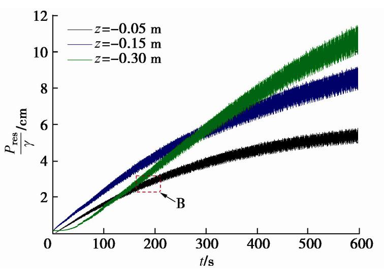 摘要: 波浪被防波堤或岸壁反射时形成驻波,使其前面的水域发生强烈振荡,海床发生液化,可能导致结构物失稳破坏。以黄河三角洲粉土海床为研究对象,进行一系列驻波水槽试验,研究驻波作用下波腹剖面土体累积液化机制,在此基础上,采用数值模型进一步研究驻波作用下波浪参数(水深、波陡)和土体参数(饱和度)对海床累积液化的影响规律。结果表明:驻波作用下海床累积液化的发生与循环应力水平有关,当循环应力比χ达到累积液化所需的临界值χcr时,发生累积液化,深层土体累积液化所需的χcr大于浅层土体。波腹剖面土体液化所需的χcr远大于波节剖面,发生初始液化所需的时间大于波节剖面,液化深度小于波节剖面。波腹剖面土体累积液化是由波节及相邻位置向波腹剖面传递的超孔隙水压力Pres1,和波腹剖面土体受循环正应力影响发生静压屈服引起的超孔隙水压力Pres2两部分共同作用所致。本试验中,在深度z=-0.05 m,波浪作用时间t≈600 s时,前者贡献比α1≈54.3%,后者α2≈45.7%。波节和波腹剖面土体累积孔隙水压力沿深度分布模式有差异,随水深减小,波陡增加,饱和度减小,海床液化深度在波节和波腹剖面均增大。Abstract: The standing waves exist when the progressive waves are reflected by the breakwater or the bank wall, which leads to the water surface oscillating where it is and the waveform doesn’t advance. Seabed soil will undergo liquefaction under standing waves, resulting in the instability of seabed foundation of marine structures. Based on the silt seabed in the Yellow River Delta of China, a series of wave flume experiments are conducted under standing waves so as to investigate the liquefaction mechanism at the antinodal section. Then, a parametric study is conducted with the proposed model to investigate the effects of the soil and wave characteristics on residual liquefaction. The results indicate that the onset of residual liquefaction is linked with cyclic stress ratio. The residual liquefaction occurs when the cyclic stress ratio χ equals the critical value χcr, and the required χcr in deeper layer is larger that of the shallow layer. The required χcr at the antinodal section is far more than that at the nodal section, and the required wave loading time is longer and the liquefaction is smaller than that at the nodal section. The horizontal transporting of pore pressure and the accumulating of plastic volumetric strain induced by cyclic normal stress contribute to the liquefaction at the antinodal section simultaneously, and the experimental results revealthat the former and the latter contribute to 54.3% and 45.7% respectively at the depth of 0.05 m. The discrepancy of the distribution pattern of the excess pore water pressure exists between the nodal section and the antinodal section. The shallower the water depth, the higher the wave steepness, and the smaller the saturability results in a deeper liquefaction depth.