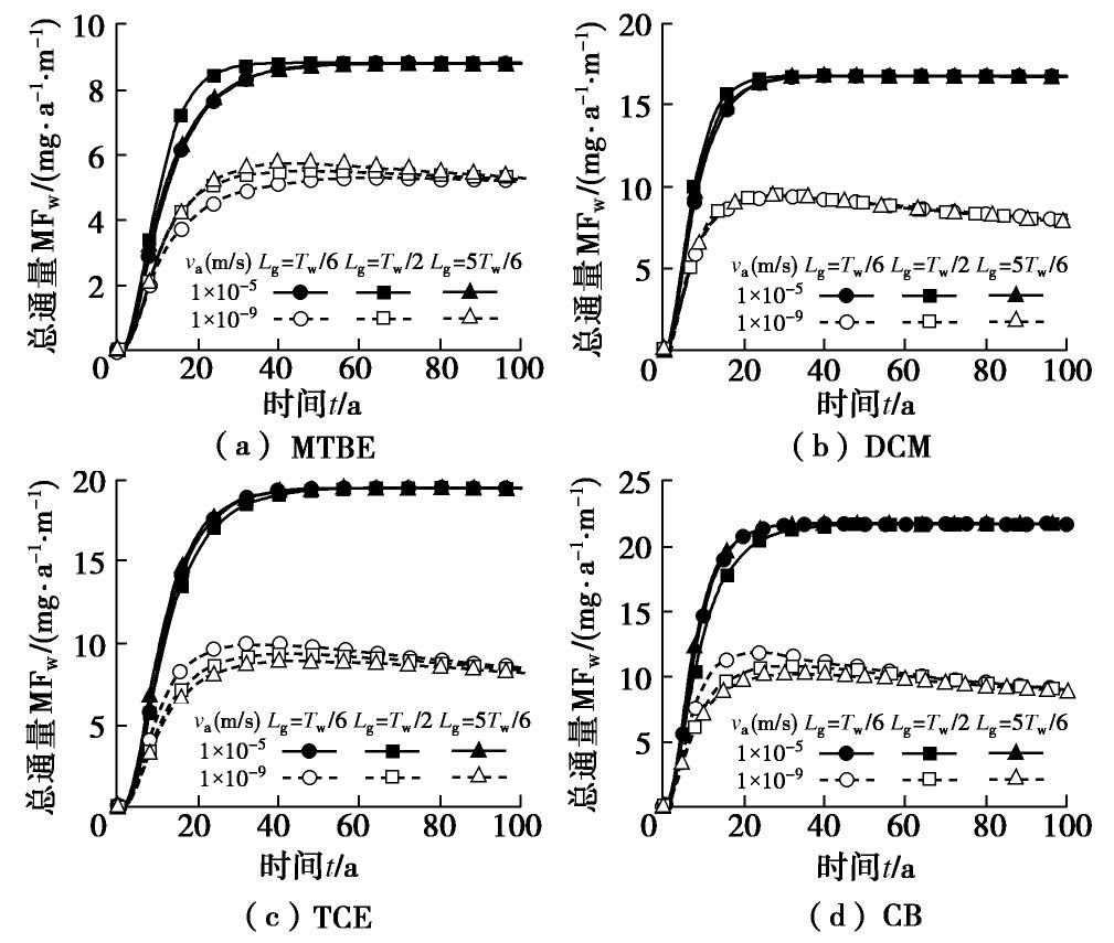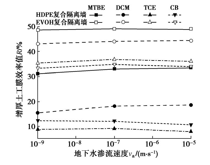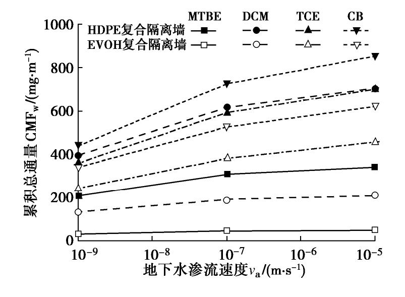 -9 m/s, the models based on the boundary conditions of zero concentration and non-advection aquifer can be applied to the preliminary design of CGCW. Furthermore, the optimal location of the geomembrane in the CGCW is closely related to the type of contaminants and groundwater flow rate of the outsider aquifer, and the difference among the cumulative mass fluxes of the outlet face in the CGCW at different geomembrane locations can reach 10%~20%. The performance of the CGCW with EVOH geomembrane is significantly better than that of the CGCW with HDPE geomembrane.