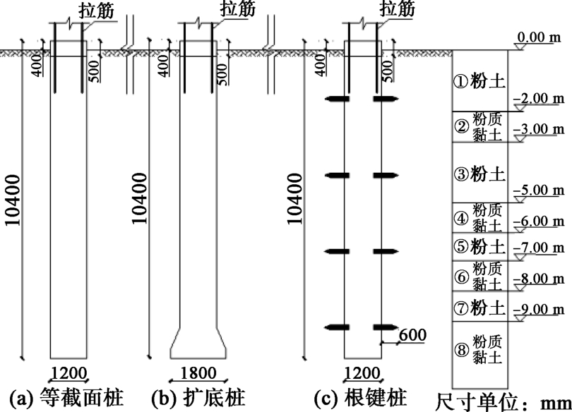 In order to clarify the load transfer model for root piles and the action law of pile-soil, the uplift bearing capacities of equal section pile, belled pile and root pile are tested.Meantime, the change rules of the bearing capacity under different densities of root are explored through numerical stimulation.The result shows that:(1)The root pile is more suitable under the conditions of complex load and strict requirements for displacement.Moreover, the multi-layer variable cross-section setting of the root pile makes the bearing capacity of material, play a further role and achieves the goal of economic saving.(2)In the test condition, the relationship between the crack rate of soil around piles and the load is exponential distribution.Under the same load, the higher the fissure rate, the lower the bearing capacity.Under the ultimate load, the higher the fissure rate, the more fully the bearing capacity of soil will be exerted.(3)Increasing the density of roots(cross-section area)is beneficial to reducing the earth pressure around the roots and preventing the plastic failure from happening in the original period of the foundation.In generally, the ratio of the roots to the branch cross-section area with the same diameter should be set from 0.1 to 0.3.