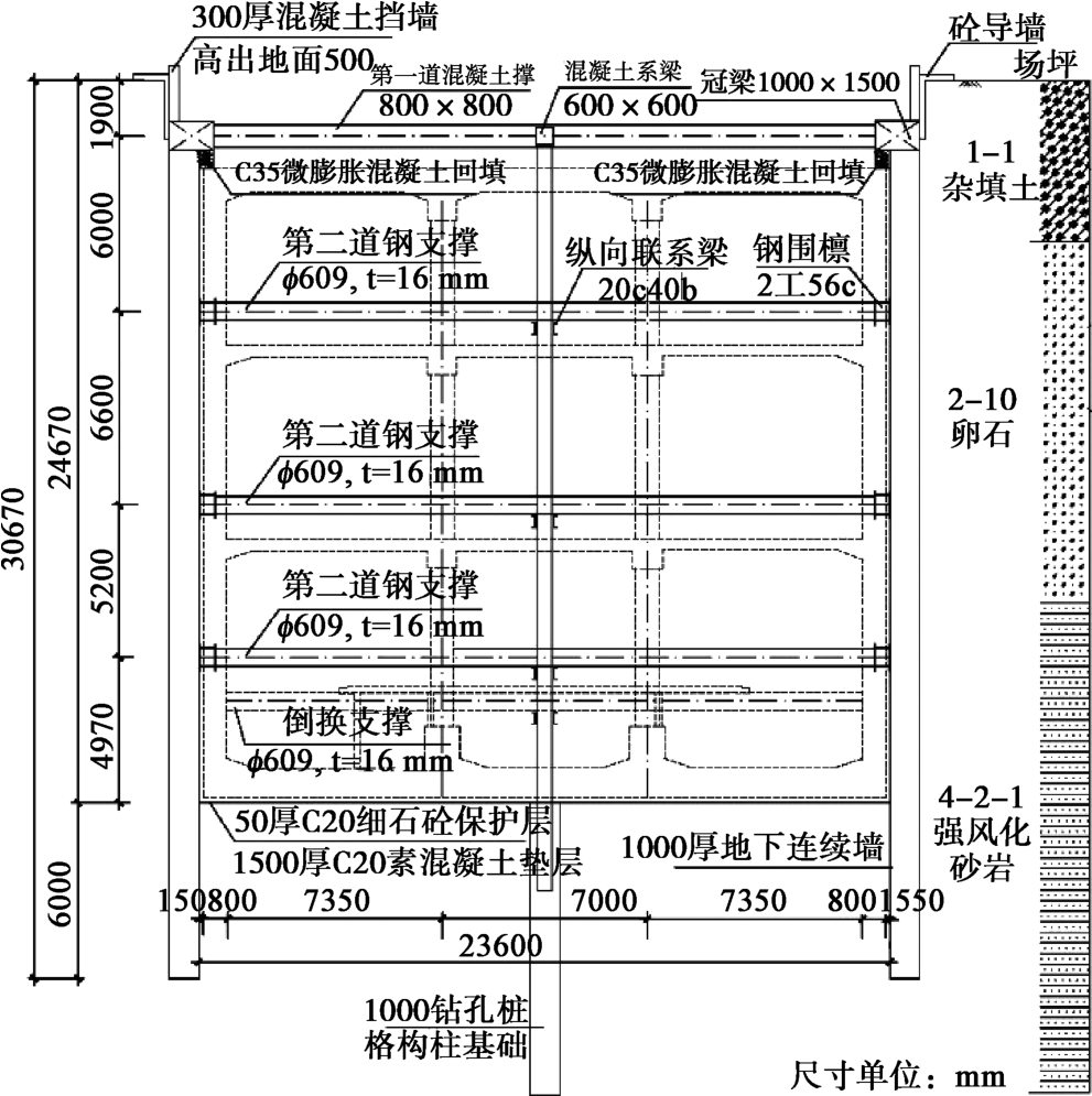 • 摘要: 兰州地区特有的富水红砂岩在开挖裸露情况下极易崩解,基坑开挖与降水异常困难,至今仍没有完整设计及施工经验可供参考。以兰州地铁雁园路站深基坑为例,通过对车站周边建筑环境、工程地质及水文条件分析,提出适宜于红砂岩深基坑的地下连续墙加内支撑支护结构体系。分析了基坑施工过程中支护结构及周围环境变形监测数据,利用Midas GTS有限元软件对基坑开挖过程进行了数值模拟,对比分析了模拟数据和监测数据,结果表明各测点变形均在安全控制范围内,说明该基坑支护结构选择合理。研究结果可为兰州地铁后续施工中遇到的类似红砂岩基坑支护结构设计提供经验借鉴。