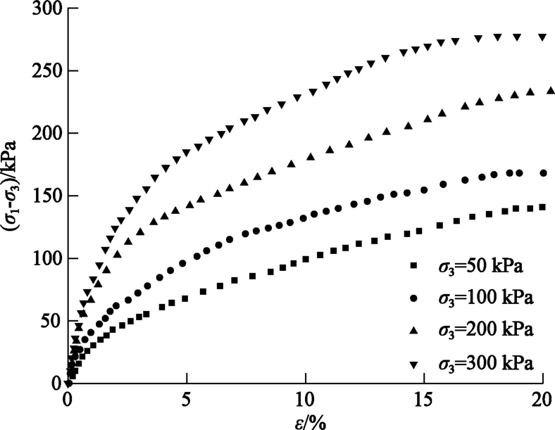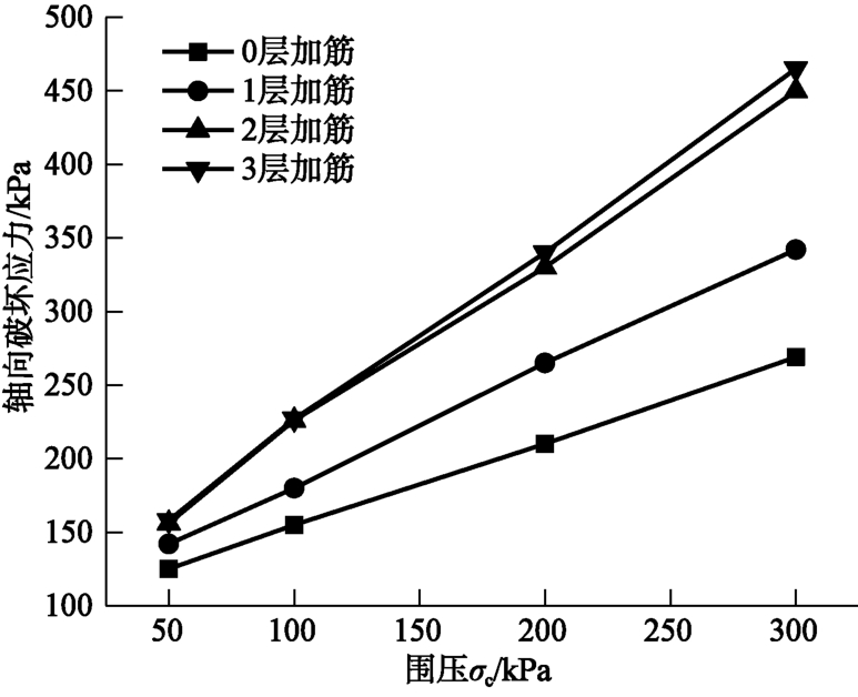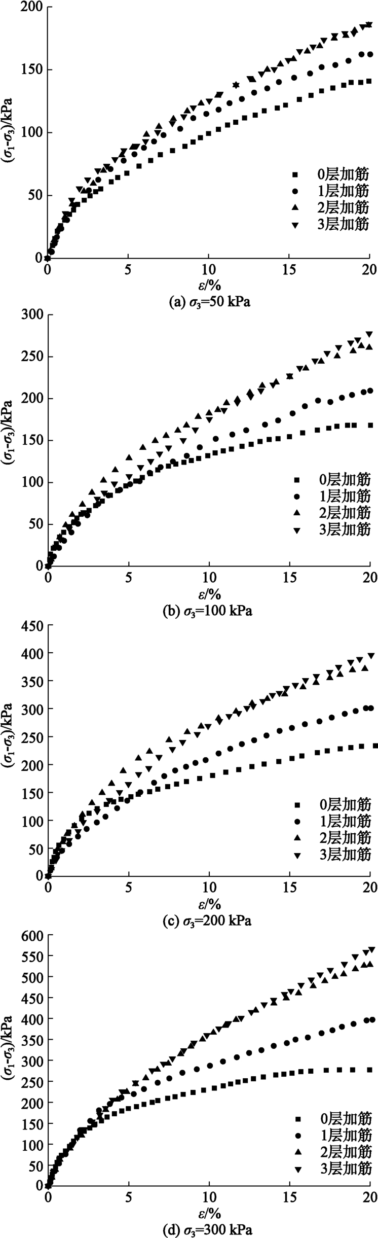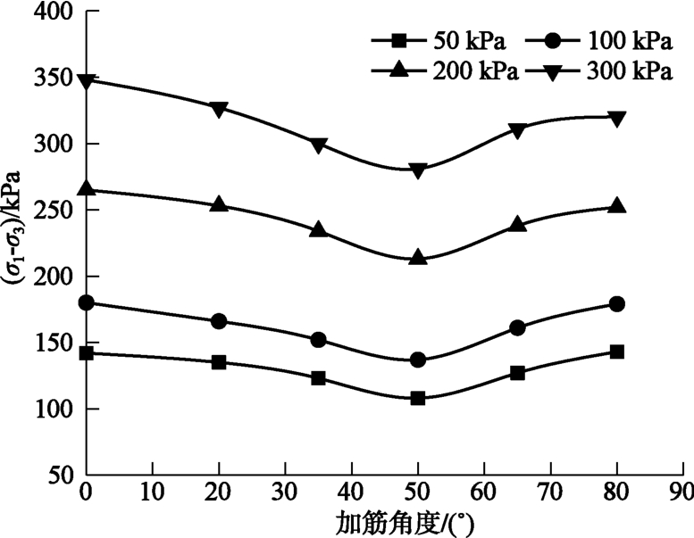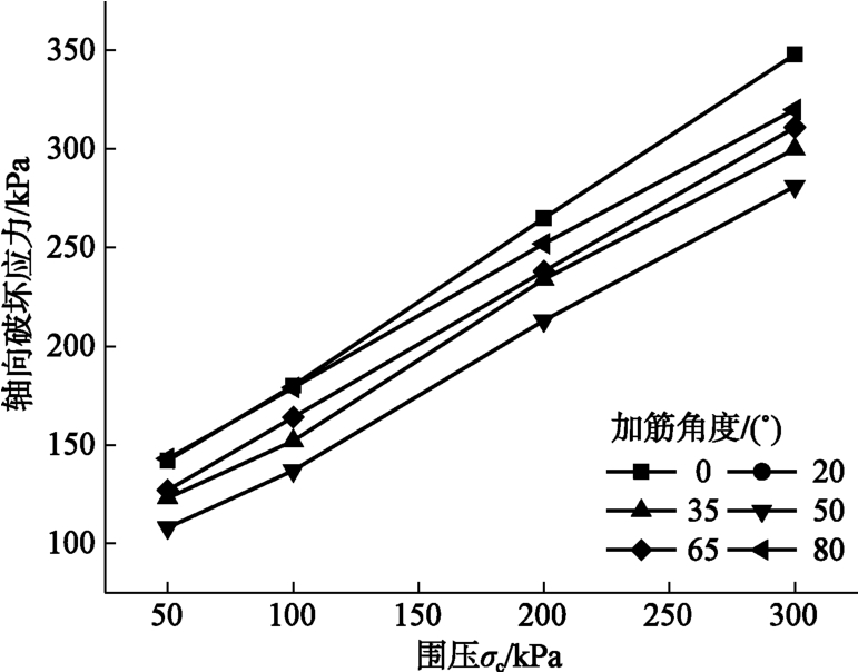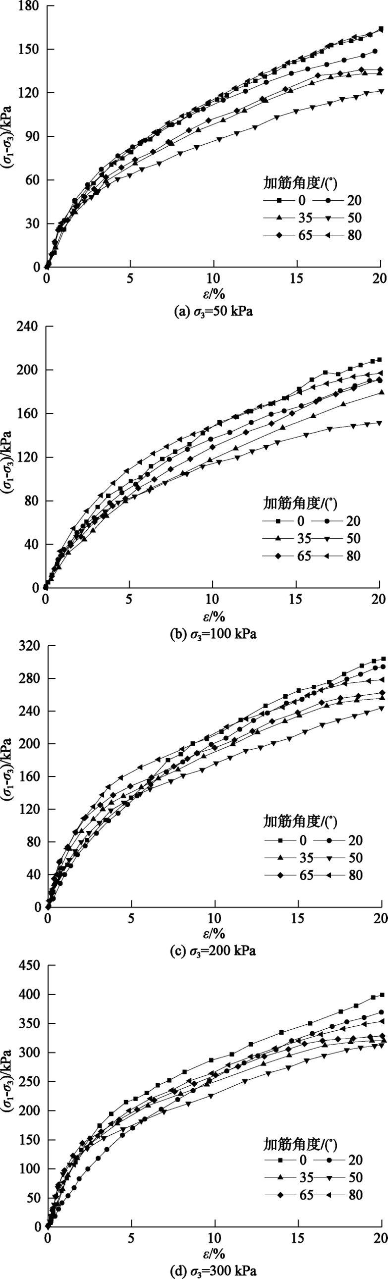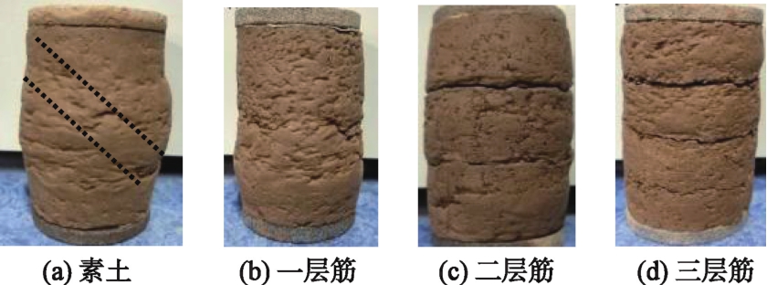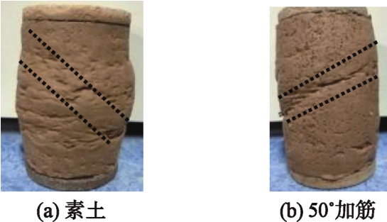 φ/2.The reinforcement effect will only play a role when the axial strain of the loess sample reaches about 3%~5%, indicating that a sufficient deformation condition is required to improve the strength of the soil, in this case, the reinforced material will show its stretchability to improve the shear strength of the soil.