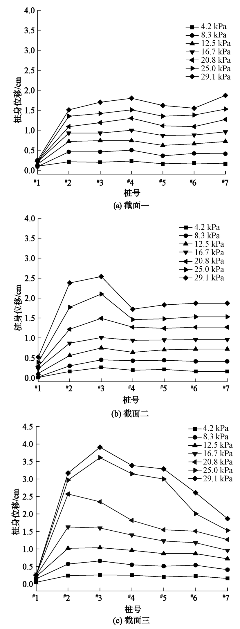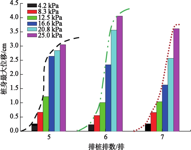 摘要: 以洛阳火车站地铁车站明挖基坑支护工程为背景,对基坑开挖过程中支护结构侧向位移变化规律开展3组小比尺模型试验,探讨基坑开挖后基坑支护桩身位移变化规律并考虑不同桩间距的影响。研究结果表明,桩身位移随着基坑深度的增加在基坑边缘处为先增大后减小,在基坑中间部位为先缓慢增加后急剧增加,最大桩身位移深度为距基坑底部1/6基坑深度处,桩身位移达3.91 cm;桩身位移随着地面荷载的增加逐渐增大,且距基坑顶部1/6处桩身位移变化幅度较小,最大桩身位移为1.8 cm,随着距离增加至距基坑顶部1/2处桩身位移变化幅度增加了41.1%,最大桩身位移为2.54 cm;当距离增加至距基坑底部1/6处桩身位移变化幅度急剧增大,最大桩身位移为3.91 cm,相比基坑顶部1/6处增加近1.2倍。研究成果对洛阳地铁火车站深基坑工程设计具有重要指导意义。Abstract: With the support project of open-cut foundation pit of Luoyang Railway Station as the background, three groups of small-scale model tests are carried out to study the variation of lateral displacement of support structures of foundation pit during the excavation process, and the variation law of displacement of support piles after excavation and the consideration of the different pile spacings are discussed.The results show that the displacement of piles increases first and then decreases with the increase of the depth of foundation pit, and increases slowly and sharply in the middle of foundation pit.The maximum displacement depth of piles is 1/6 of the depth of foundation pit at the bottom of foundation pit, and the displacement of piles reaches 3.91 cm.The displacement of pile body increases with the ground load.The maximum displacement of piles is 1.8 cm.The displacement of piles increases by 41.1%and the maximum displacement of piles is 2.54 cm as the distance increases to 1/2 of the top of foundation pit.When the distance increases to 1/6 of the bottom of foundation pit, the displacement of piles increases sharply.The maximum displacement of piles is 3.91 cm, which is nearly 1.2 times larger than that of the top 1/6 of the foundation pit.The research results have important guiding significance for the design of deep foundation pit of Luoyang Railway Station.