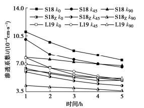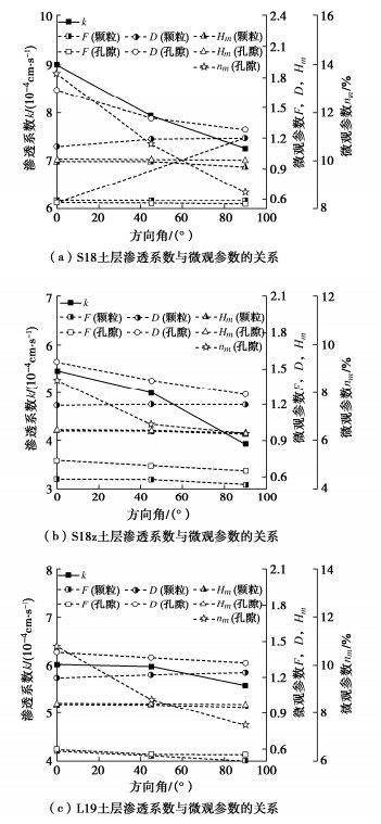 • 摘要: 为研究含渐变带天然黄土的渗透各向异性特征,以含黄土层(L19)、古土壤层(S18)以及两者之间渐变带(S18Z)的早更新世(Q1)黄土为例,获取了各土层在0°,45°,90°方向的饱和渗透系数,并计算了相应的孔隙度nm、形状系数F、形态分维数D、概率熵Hm等微观结构参数,分析了微观结构参数对渗透系数的影响。结果表明:①除概率熵外,孔隙和颗粒的微观结构参数均具有各向异性特征,渐变带土层的微观结构特征与相邻土层存在显著差异;②各土层沿沉积方向渗透系数均最大、渗透能力随渗流时间衰减最快,沿垂直沉积方向渗透系数均最小、渗透能力衰减最慢;③微观结构参数对各土层渗透系数的影响程度均表现为nm > F(孔隙) > F(颗粒) > D(孔隙)>D(颗粒)> Hm(孔隙)≈Hm(颗粒),其中孔隙度对渗透性能的贡献约可达到30%;④渐变带土层的渗透性能最差,水分易在渐变带发生累积,导致含水率提高,弱化土体力学性质,需要重点关注。