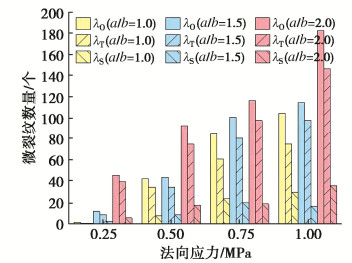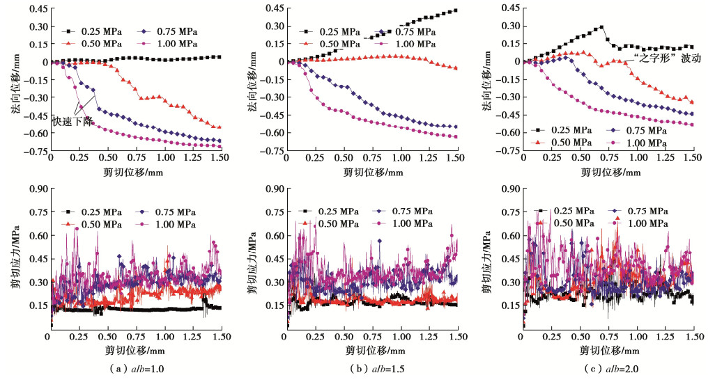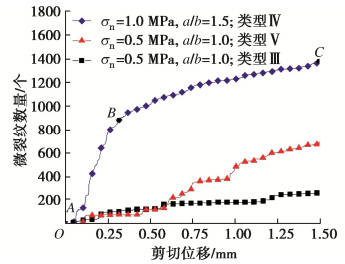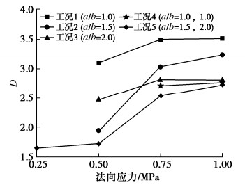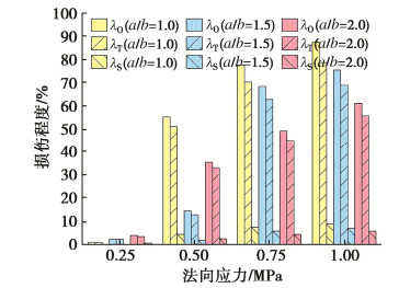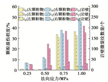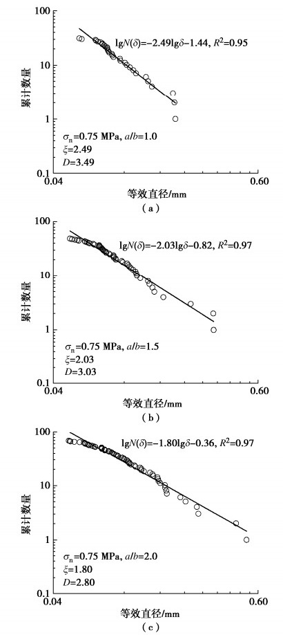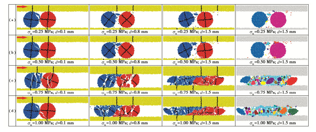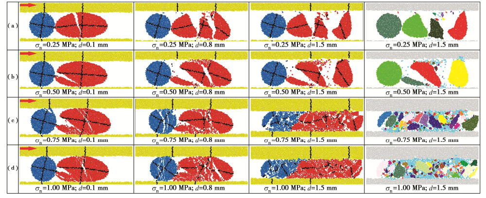 • 摘要: 采用PFC研究不同法向应力下颗粒充填岩石不连续面的剪切力学性质,重点关注颗粒形状(以长、短半轴长比a/b表示)和组合方式的影响。结果表明:①单颗粒的剪切运移和破坏可归纳为滚动、滚动-滑动、压碎-滚动运移和碾碎、滚动-压碎破坏5类,取决于法向应力和颗粒形状,不同破坏类型下微裂纹演化特征明显不同;颗粒的破碎程度整体随法向应力的增加而增加,随a/b的增加而降低,不连续面壁磨损程度随法向应力和a/b的增加而增加;张拉裂纹是引起颗粒及不连续壁面破坏的主要原因;颗粒破碎后形成的碎屑混合物的尺寸分布可用幂指数(或分形维数)D表征,D越小,颗粒破碎程度越低。②充填同种形状的双颗粒时,颗粒及不连续面壁表面的细观粗糙度是造成剪切力学性质差异的主要原因;充填不同形状的双颗粒时,a/b较大的颗粒承担了更多的压剪荷载,破碎程度更高;颗粒间的摩擦也对其表面磨损及剪切运移破坏过程产生重要影响。③不连续面的平均摩擦强度与充填碎屑混合物的尺寸分布密切相关,a/b增大或法向应力减小导致生成的较大角砾状碎块数量增加,进而引起总体摩擦强度增加。提出了估算颗粒充填不连续面平均摩擦强度的经验关系式,并通过文献中的数据对该公式进行了初步验证。