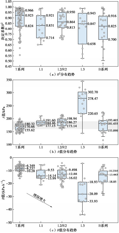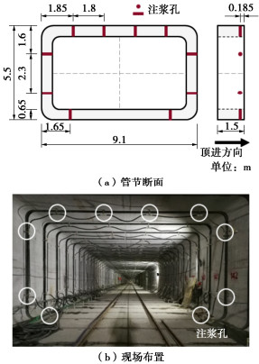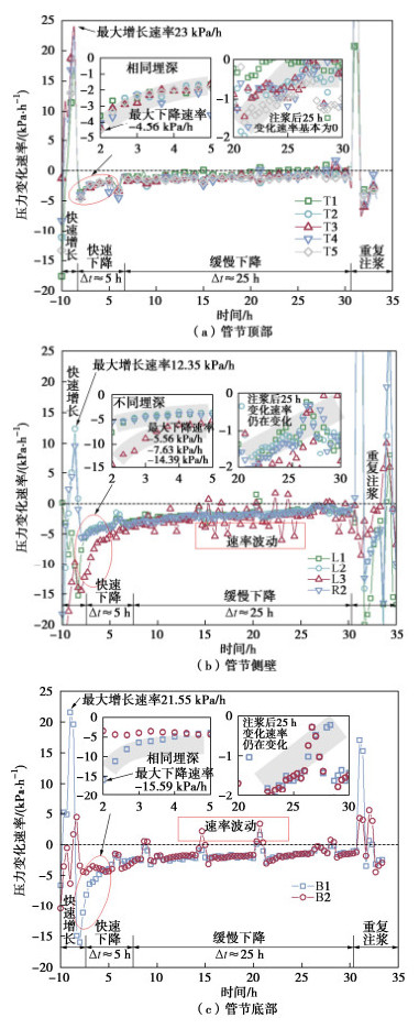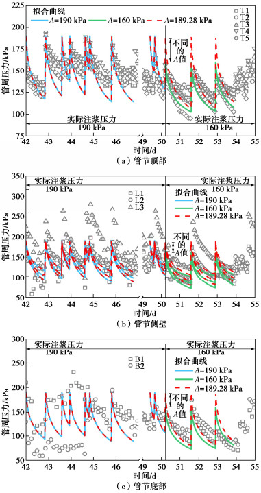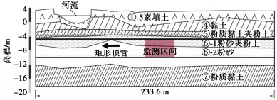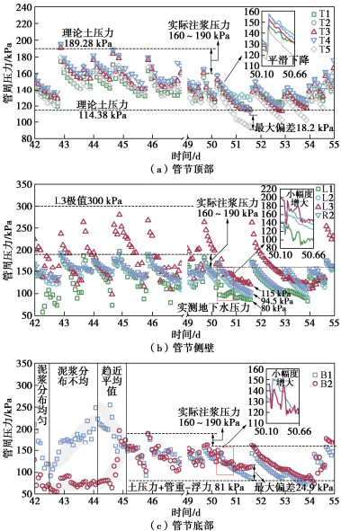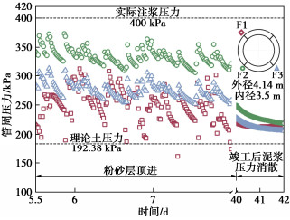 • 摘要: 顶管施工中的管周压力时空分布特征是研究顶进力、摩阻力、管节结构内力、泥浆渗透规律的基础,但目前针对矩形顶管的相关研究较少。依托苏州矩形顶管工程,首先基于原位监测结果分析施工时管节顶部、侧壁、底部的压力时空分布规律,然后建立泥浆滤失过程中的管周压力预测模型,基于矩形顶管管土接触状态及受力特点提出预测函数中相关参数的求解方法,最后对比检验预测值与实测值。结果表明:管周压力在注浆-滤失过程中随时间依次经历快速增长阶段、快速下降阶段和缓慢下降阶段;管周同一深度的管周压力及变化速率基本一致,而不同深度在各阶段的管周压力、压力稳定值、变化速率有所区别;采用对数回归函数可较好拟合现场实测值,相关参数的求解考虑了土体性质、覆土埋深、地下水压力、管节自重、泥浆浮力、实际注浆压力等工程参数,适用于预测类似矩形顶管工程施工中的管周压力。