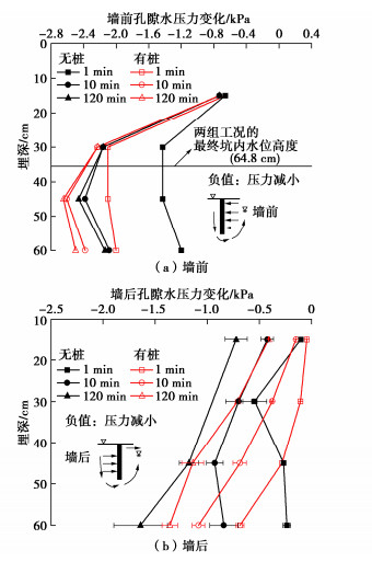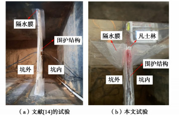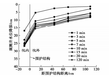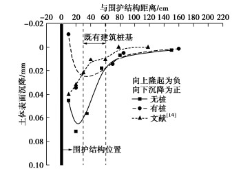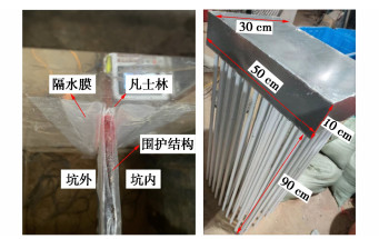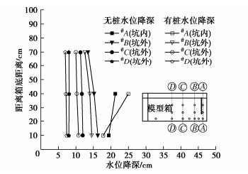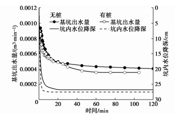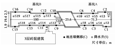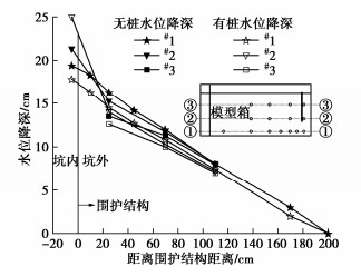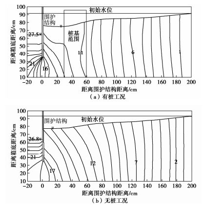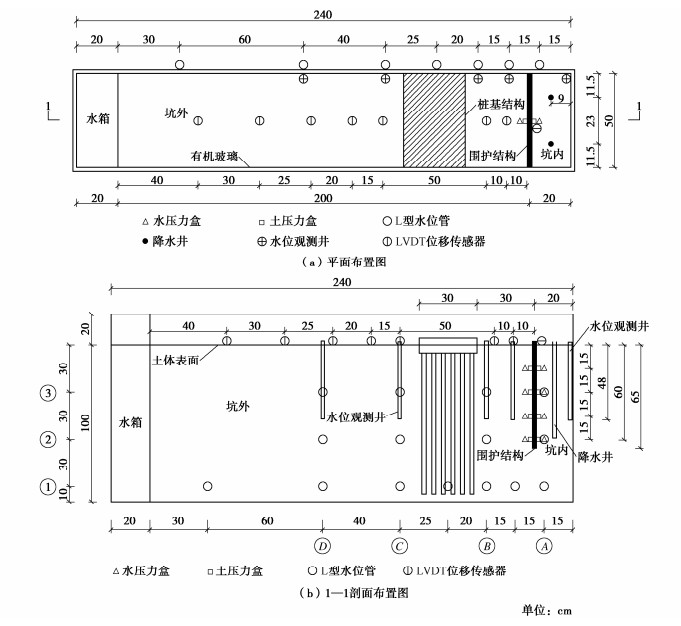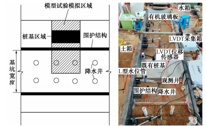 The existing underground structures in urban areas can block the groundwater flow and soil movement (i.e., barrier effects). On this occasion, the design and construction of foundation pits should consider the influences of the barrier effects. However, the mechanism of groundwater seepage and deformation of foundation pits under the barrier effects of the adjacent structures has not been fully revealed. In this study, two laboratory-scale tests are conducted based on a metro foundation pit in Tianjin. A series of stress and deformation sensors are placed in the physical model for pit-soil-structures (taking pile foundation as an example) to monitor the real-time variation of water level, deformations of retaining wall, settlements of ground surface, and pore-water and earth pressures at both sides of the retaining wall during dewatering of the foundation pit. Based on the tests, the deformation laws of the retaining wall and surrounding soil caused by dewatering considering and without considering the adjacent pile foundations are discussed. The mechanism of deformation of the foundation pit induced by dewatering under the barrier effects of pile foundations is also revealed. Two main conclusions are drawn: (1) Larger groundwater drawdown in the pit can be caused by smaller water yield due to the barrier effects of pile foundations on groundwater flow. In this case, the number of pumping wells in the pit can be appropriately reduced to achieve the same pumping effects. (2) The barrier effects of the adjacent pile foundations on the ground movement may lead to a larger lateral pressure in front of the retaining wall and a smaller lateral pressure behind the enclosure wall. On this occasion, the deformation of dewatering-induced retaining wall and settlement of ground surface outside the pit may be much smaller. The effects of the adjacent underground structures on the foundation pits should be considered in the design so that a more reasonable supporting scheme and construction plan can be obtained.