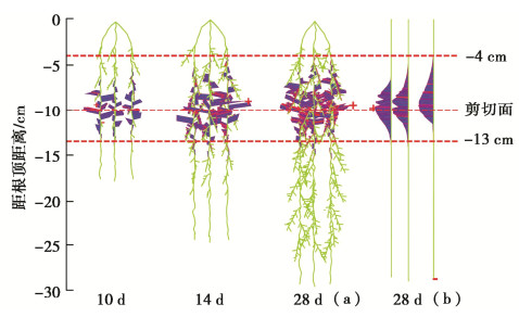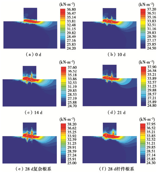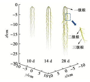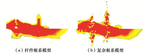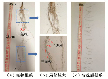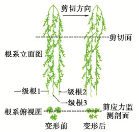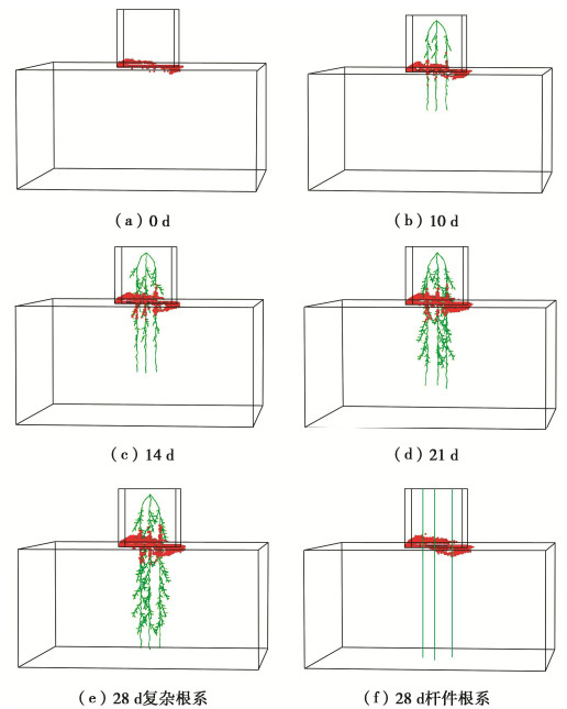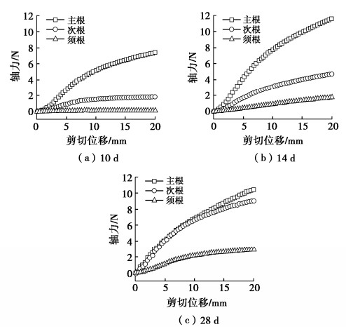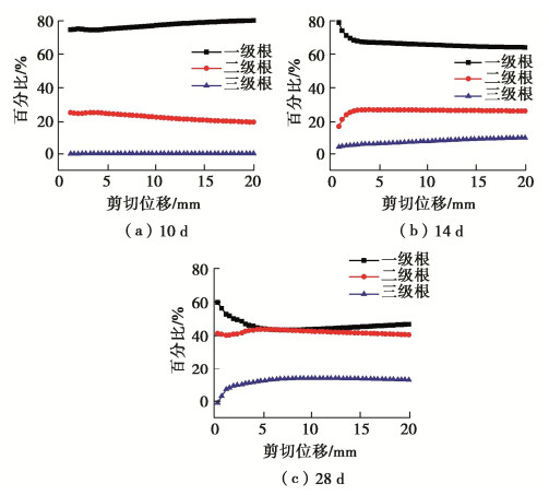 The structural characteristics of plant roots, including morphology and topological structure, have significant effects on the mechanical characteristics of root-soil composites. The mechanical behaviors of the root-soil composites at different time are obtained by carrying out the Lolium perenne root system morphology parameter tests and direct shear tests. By using the self-developed MechRoot program, a numerical model for the root-soil composites with more realistic root structural characteristics of Lolium perenne is established, and the axial force levels and proportions of roots with different shapes and topological structures in the process of direct shear are studied, which illustrates the influences of morphology and topological structures of roots on the mechanical characteristics of root-soil composites and the mechanism of soil consolidation. The results show that the plant roots can strengthen soil significantly, and the increase of shear strength of root-soil composites is mainly caused by the increase of cohesion, with the maximum increase of 4.99 kPa. During the shearing process, with the increase of the morphological complexity of roots, the more range of soil can participate in the resistance of shear by the roots, the shear zone and plastic zone around the roots increase and are concentrated around the roots, and the shear strength of the root-soil composites increases. At the same time, the effects of the roots at several levels change gradually. The axial forces of the primary roots, secondary roots and fibrous roots are 3.87, 1.50 and 0.15 N. With the growth of the roots, the proportion of the secondary roots and fibrous roots participating in soil fixation of the roots increases continuously, with the maximum contributions being 43.69% and 13.80%, respectively.