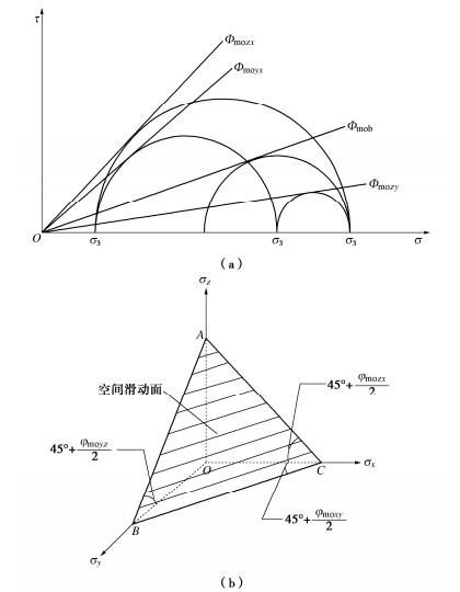 The geotechnical materials in nature are affected by the natural sedimentation and often have significant cross-isotropic characteristics. The difference in strength and deformation of structural units of soil in different directions is the main issue that should be considered when affecting the design and construction of large-scale civil and hydraulic projects. The research on the cross isotropy of geotechnical materials is of great scientific significance to the safety and stability of actual engineering structures. Based on the study on the relationship among the strength variation of octahedral principal stress space domain, the spatial mobilized plane and the stress state, a comprehensive parameter reflecting the stress conditions and material properties is defined. By analyzing the relationship among this parameter, the failure stress and the stress state, the physical meaning of the parameter is clarified, and based on the space plane strength theory, the sliding failure of the three principal stress planes is considered. It is assumed that the space on the ratio of the shear stress to the normal stress is constant, and a cross-isotropic failure criterion is established considering that the spatial sliding surface of geomaterials changes with the stress conditions of the spatial stress domain. Compared with the experimental results, it is shown that the cross-isotropic failure criterion based on the spatial mobilized plane variation can better reflect the strength characteristics of the materials, and it is particularly applicable to the strength prediction of the stress region when the principal stress axis deflects.