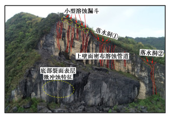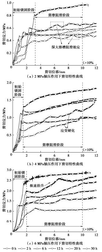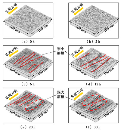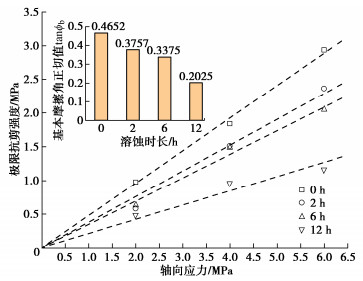 The dissolved rock mass is widely distributed in Southwest China. Under the action of karst, the continuous deterioration of structural plane strength is one of the important factors affecting the stability of rock mass. In order to explore the evolution characteristics of structural plane under dissolution and to reveal the influences of karstification on the shear mechanical properties of limestone structural plane, based on the example of the dissolution rock slope of Jiwei Mountain in Wulong, the apparent evolution patterns of limestone structural plane and the evolution laws of shear mechanical properties as well as the deterioration mechanism of structural plane are expounded by using the indoor seepage dissolution and direct shear tests on the structural plane and the three-dimensional morphology optical scanning technology. The results show that under the dual action of chemical corrosion and physical erosion, the limestone structural plane has experienced four stages: point selective dissolution, thin groove linear stable seepage dissolution, strong dissolution of dominant pipeline flow and wall slow dissolution. During the dissolution process, the surface roughness index and dissolution rate index of limestone structural plane increase with the increase of dissolution time, and exhibit a convergence trend. During the direct shear process, the corrosion structural plane shows two-stage characteristics of the initial locking and the later shear friction and sliding, and the longer the corrosion time and the higher the stress level, the more obvious the shear hardening characteristics. With the increase of the corrosion time, the main anti-sliding structure of the structural plane develops from a rigid stable microconvex to a fine solution groove and finally evolves into a deep karst pipeline, and its ultimate shear strength shows a trend of " first decreasing, then increasing". The prediction model for shear strength of limestone dissolution structural plane is established based on the Barton's formula.