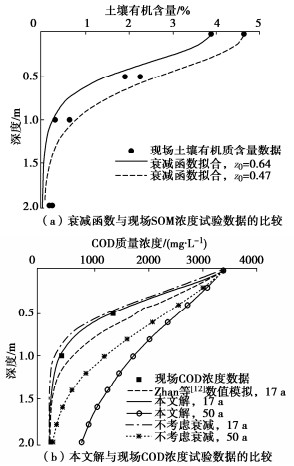 Q≤1). Without considering the attenuation of reaction parameters, the breakthrough concentration of hydrophilic organic contaminants and hydrophobic organic contaminants can be underestimated by 61% and 37% respectively. The field monitoring data can be better fitted by the proposed model, and it can be used to evaluate the effectiveness of landfill liners. It can also be used for the design of composite liners and the verification of complex numerical models.