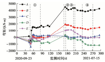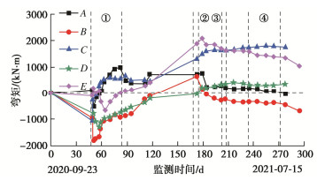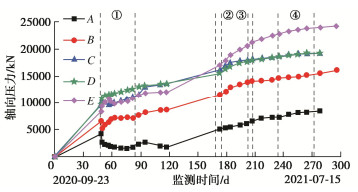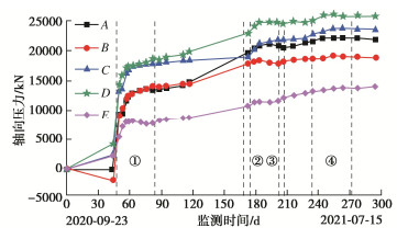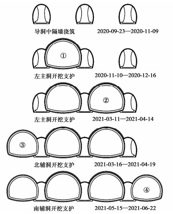 • 摘要: 依托长沙观音岩不等跨四连拱公路隧道工程,选择典型断面对主、辅4个正洞施工全过程中隔墙墙身内力进行现场监测分析,获得其在多洞室开挖、频繁扰动下的力学特征,并验算其安全性。结果表明:四连拱隧道中隔墙结构受力受到相邻的先行洞室开挖影响最大,不相邻洞室开挖对其影响较小;中间位置的中隔墙所承受荷载较两侧的更大,正洞开挖对其影响更明显;施工全过程各中隔墙结构的安全性均满足要求,说明其结构设计和施工措施合理。研究成果可为复杂条件下多连拱隧道的设计与施工提供借鉴。