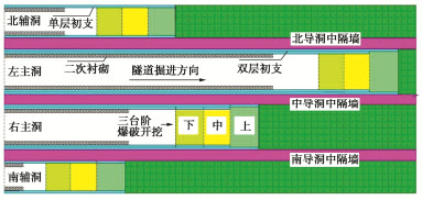 Abstract: Based on the Guanyinyan unequal-span four-arch highway tunnel project in Changsha, a typical section is selected to test and analyze the internal forces of the partition walls during the whole construction process of two main caverns and two auxiliary caverns so as to obtain their mechanical characteristics under frequent disturbances caused by excavation of multiple caverns. The results show that the stresses of the partition walls of the four-arch tunnel are most affected by the excavation of adjacent firstly-excavated caverns, and less influences on them are caused by the excavation of non-adjacent caverns. The partition wall in the middle is subjected to greater loads than those at both sides, and it is more obviously affected by the construction disturbances. The safety of each partition wall structure during the whole construction process meets the specification requirements, indicating that its structural design and construction measures are reasonable. The research results provide reference for the design and construction of multi-arch tunnels under complex conditions.