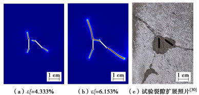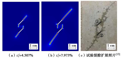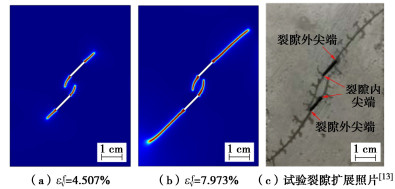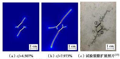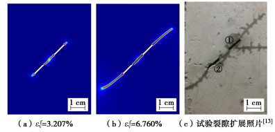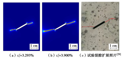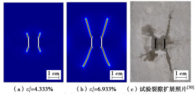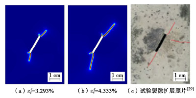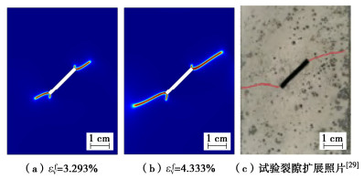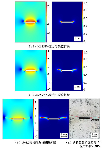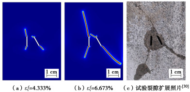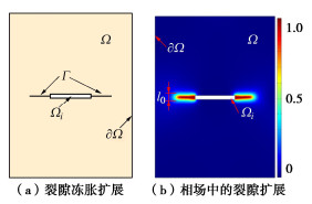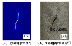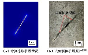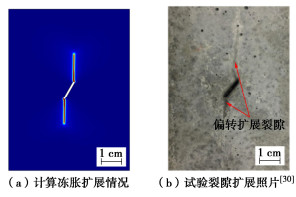 As the rock masses in cold regions freeze, water in cracks turns into ice and expands in volume, and the mechanical interaction between ice and rock may lead to the frost propagation of cracks. To study the prediction method for the frost propagation of cracks and further cognize the laws of the frost propagation under different conditions, the phase-field model which represents cracks in a diffusive way with a scalar field is introduced to simulate the frost propagation, and the method for the equivalent thermal expansion coefficient is utilized to simulate the volume expansion of ice in cracks due to phase transition. Moreover, the governing equations for stress field for ice-rock interaction and the governing equations of phase-field evolution for the frost propagation of cracks are solved through the COMSOL Multiphysics software. Numerical simulations with the phase-field model on the frost propagation are conducted based on a series of frost propagation experiments on the rock masses. The numerical results are similar to the experimental ones for both the frost propagation of a single crack under different dip angles and external loads, and the frost propagation of double cracks under different dip angles of rock bridge and different intersection angles. It is indicated that the phase-field model established can accurately simulate the frost propagation of cracks in the rock masses. Furthermore, when subjected to an external load, the frost propagation of a single crack deflects towards the direction of the load. For the double cracks with different dip angles of rock bridge, the frost propagation of inner tips always deflects towards the adjacent crack due to the interaction of two cracks, while the outer tips propagate approximately along the coplanar direction. For double cracks with different intersection angles, two independent new frost cracks in a butterfly shape will form when the two cracks are parallel to each other, while new frost cracks in a radiation shape will form for the double cracks with an inclined intersection angle.