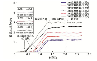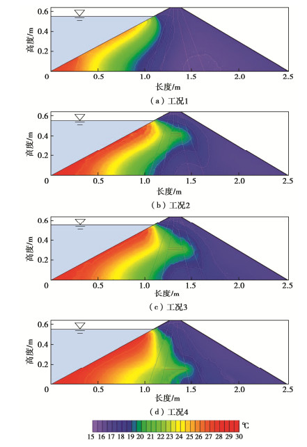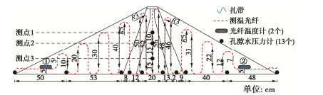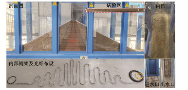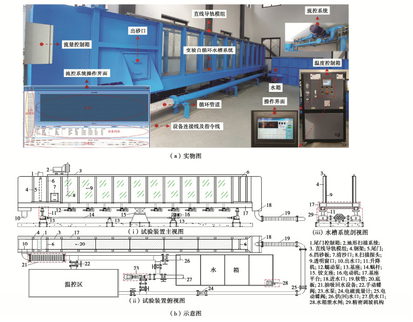 To accurately simulate the seepage characteristics of earth-rockfill dams during leakage, a test device is developed. The device can precisely control the test variables such as platform slope, water supply discharge, water temperature, etc. The device can realize the automatic check of the flatness of the side wall and the bottom plate, the automatic control of the flow control system and the temperature control system, the water circulation of various water supply and suction combinations, and piecewise or linear temperature rise and drop control of the upstream reservoir water, dynamic monitoring of dam body temperature field, volume deformation and pore water pressure. A clay core wall rockfill dam is selected as the research object, and the leakage tests on earth-rockfill dams are conducted. The results show that the leakage will change the seepage field and temperature field of the dam body, causing the surrounding temperature value to change significantly. With the gradual downward movement of the leakage area, the temperature value at the location increases significantly, the fluctuation of the saturation line and the seepage rate of the dam also increase, and the adverse conditions affecting the seepage stability of the dam body gradually increase. The test device can accurately simulate the real situation of various working conditions and the influences of multiphysics coupling effects on the leakage occurrence and development process of earth-rockfill dams, and it can monitor the evolution of various physical fields in the leakage development process in real time, providing an effective technical tool for the in-depth study on the seepage characteristics of earth-rockfill dams.