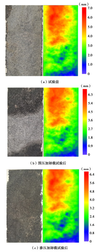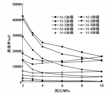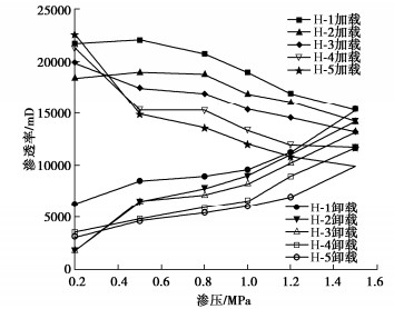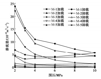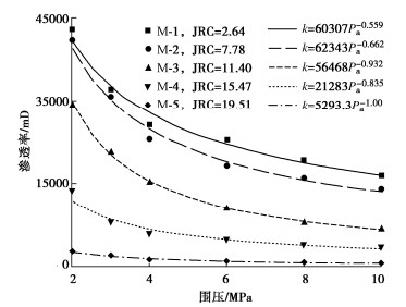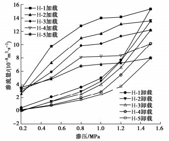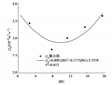 R2 of 0.9583. There is an obvious hysteretic effect during the unloading of the confining pressure. The JRC has a great influence on the hysteretic degree during unloading, which is logarithmic with the decline and recovery. During the process of loading-unloading of pressure, the change of seepage flow through the single fracture is positively correlated with the osmotic pressure, while the permeability decreases continuously. There is a good correlation between the decreased value of seepage flow through the single fracture and the JRC after a cycle of loading-unloading of pressure. A prediction model for seepage flow of fracture after loading-unloading of osmotic pressure is proposed.