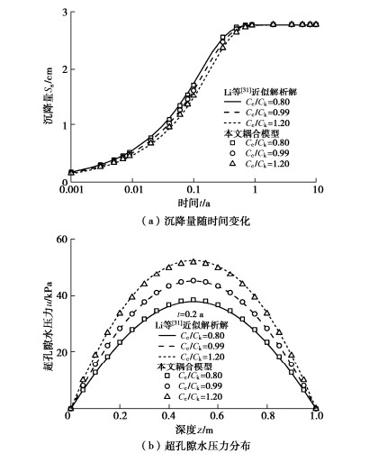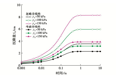 Cb on the settlement, excess pore water pressure and transport rate of contaminants are reduced when the nonlinearity is considered.