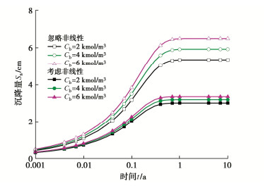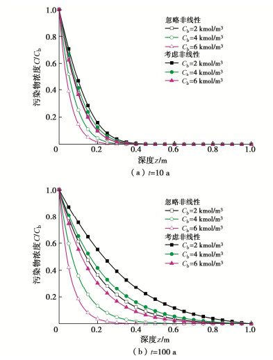 Cb in leachate on the coupled process under two assumptions are compared and investigated. The results show that when the nonlinear compressibility and permeability characteristics are neglected, the increase of