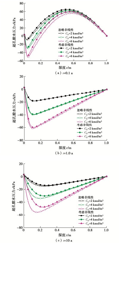 Cb increases the settlement, reduces the excess pore water pressure and decreases the transport rate of contaminants. Compared with the case of ignoring nonlinearity, the effects of