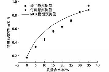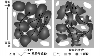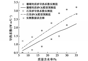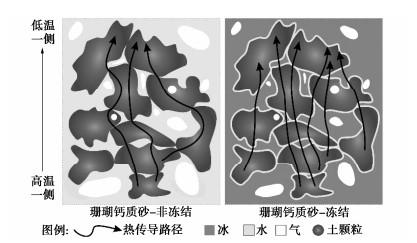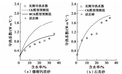 The artificial freezing construction process is determined through the thermal properties of coral calcareous sand in the South China Sea, however, the heat transfer among calcareous sand particles is still unclear. The classic Côté-Konrad (CK) model is difficult to be directly used in calcareous sand because of the irregular shape, high angularity and long heat transfer path among particles. To fill this gap, a relative particle evaluation parameter (\mu ) is defined, and a modified CK (MCK) model is established with consideration of \mu . The MCK model is used to describe the relationship between water content and thermal conductivity in unfrozen calcareous sand. A serious of laboratory tests are conducted to verify the MCK model. The results indicate that the mean absolute error, root mean square error and mean absolute percentage error are 0.098 W/m℃, 0.011 W/m℃ and about 10%, respectively, which are much less than those of CK model (0.286 W/m℃, 0.098 W/m℃ and 40%). In the frozen calcareous sand, the CK model is still applicable because ice can fill the surface pores of solid particles and enhance connectivity, which reduces the influences of particle shape on thermal conductivity.