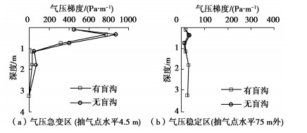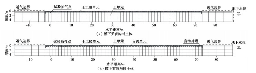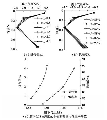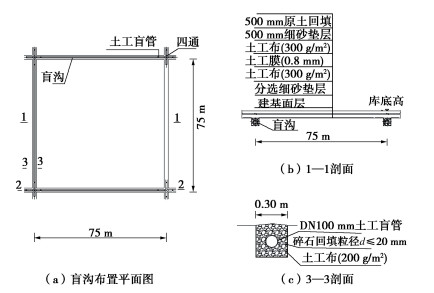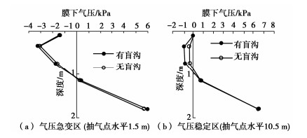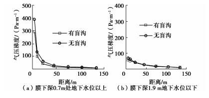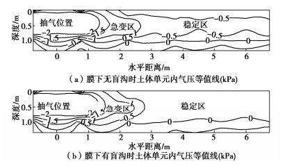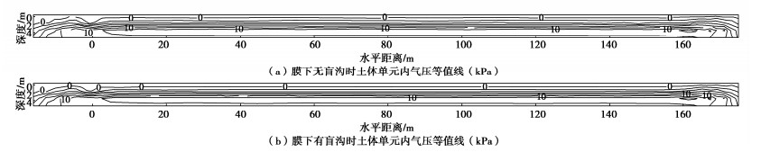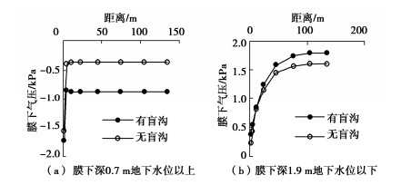 The French drains beneath the geomembrane are an important engineering measurement for the geomembrane as anti-seepage structures of reservoirs, and have a decisive effect on the air exhaust beneath the geomembrane. The conversion relationship between the permeability coefficient and the square of path length is proposed on the basis of the principle of equivalent flow variation. It is deduced that the important reasons for the bulge of the geomembrane are the huge reservoir area and the long drain path because of the air resistance of French drains. The simplified method for consolidation of unsaturated soils is used to calculate and simulate the air pressure distribution beneath the geomembrane under the condition of vacuuming. The comparison between the measured and calculated values in the field tests has verified the rationality of the proposed method and parameters. The results reveal that a pressure changing zone and a stable zone exist along the horizontal direction whether there is a French drain or not. The pore-air pressure changes significantly in the zone of a range of 2.5 m along the horizontal direction from the vacuuming spot, which indicates the existence of the air resistance of French drain. The distribution of pressure gradient beneath the geomembrane reflects the change of the air resistance of French drain. The main influencing factors for the air resistance of French drain are the air intake value and the degree of saturation of materials. Reducing the air intake value and lowering the degree of saturation are beneficial to reducing the air resistance of French drain. The research results may provide a scientific theoretical basis for the evaluation of the design of anti-seepage scheme of the geomembrane.