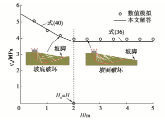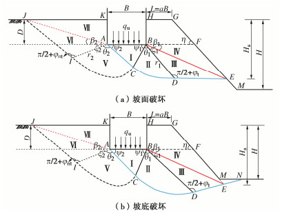 The asymmetric failure modes involving the slope face failure and the below-toe failure are proposed, and then new solutions of Meyerhof's bearing capacity for strip foundations near slopes are presented by adopting the shear strength equation of unified strength theory under plane strain conditions. The combined effects of the intermediate principal stress, the horizontal distance of foundation from the slope shoulder, the slope height and the base roughness are taken into account. The specific application steps of the obtained solutions are provided, and theoretical degradation analysis and comparison verifications are conducted. It is found herein that the proposed asymmetrical failure mode considering the contribution of soil strength behind the slope is more consistent with the actual failure behavior of foundations near slopes. The obtained solutions of Meyerhof's bearing capacity for foundations near slopes are in good agreement with those of the model tests and numerical simulations in the literature. The intermediate principal stress has a marked improvement effect on the bearing capacity of foundations near slopes. The bearing capacity of foundations near slopes first decreases and then remains unchanged with the increase of the slope height. This study accounts for practical engineering conditions, such as the intermediate principal stress effect of soil strength, the asymmetry of failure modes and soil strength at foundation lateral side, which is of theoretical guiding significance to the optimal design of foundations near slopes.