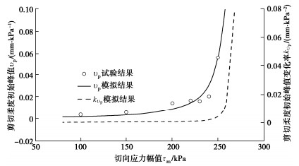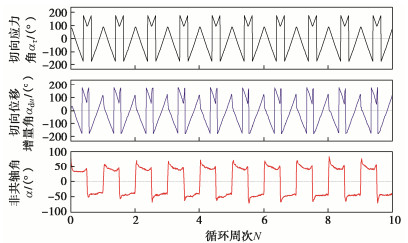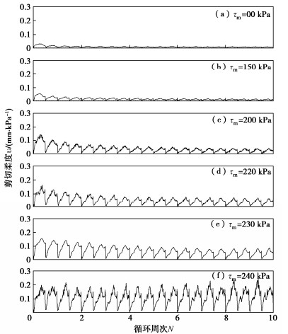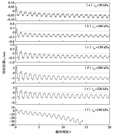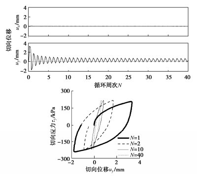y directions and their migration, non-coaxial angle, shear flexibility and shear coupling effect. The tangential displacement amplitude and the peak shear flexibility almost remain invariable with cyclic shearing when the shear stress amplitude reaches the critical stress amplitude. The unity of opposites is discovered between the stabilized non-coaxial angle and the initial peak shear flexibility of the interface. The shear stress amplitude primarily impacts the magnitudes of the performance parameters of the interface, instead of their relationship patterns. Increasing the shear stress amplitude results in magnified tangential displacement amplitudes in the