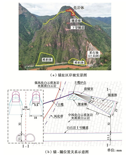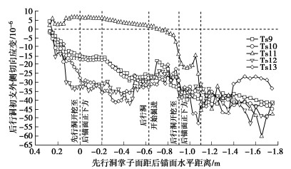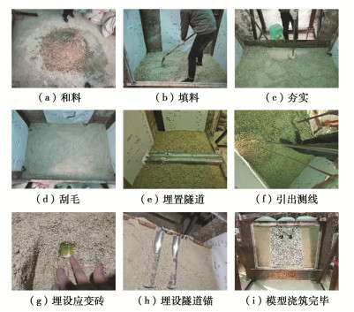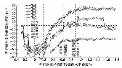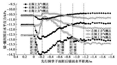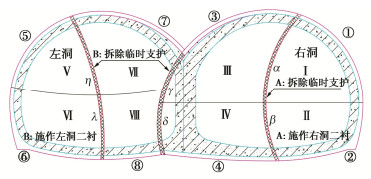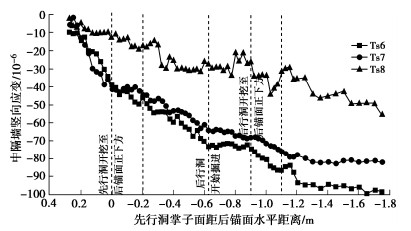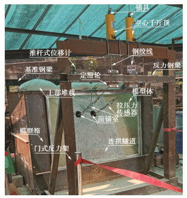 In order to study the influences of approaching construction between underpass tunnel and tunnel-type anchorage on the mechanical characteristics as well as the stress characteristics of the underpass tunnel in the bearing stage of the tunnel-type anchorage, taking the project of Baishiyan tunnel Ⅰ under the tunnel-type anchorage of Lüzhijiang bridge of Yuxi-Chuxiong Expressway as the research object, a 1∶100 scaled model test is carried out. The main conclusions are drawn as follows: (1) The settlement of the anchor plug is mainly caused by the excavation of the advanced tunnel of the multi-arch tunnel, and the disturbance by the following tunnel excavation is not obvious. (2) The stress of the surrounding rock between anchorage and tunnel has experienced three development stages: stress concentration, stress transfer and stabilization. The time of abrupt change of the horizontal stress of the surrounding rock is earlier than that of the vertical stress. (3) The bearing effect of the initial support is obvious during tunnel excavation. With the removal of temporary support, the pressure of the surrounding rock borne by the initial support gradually turns to the middle wall. (4) When the cable tension is applied to anchorage, the surrounding rock between anchorage and tunnel will enter the plastic state, and leading to large tensile stress at the spandrel and vault of the tunnel.