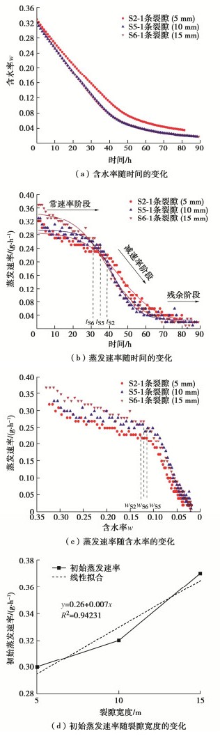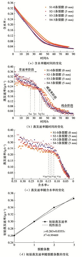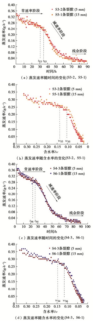 Under the action of arid climate, the soils in the engineering are prone to develop shrinkage cracks, and the existence of cracks has an important influence on the engineering properties of the soils. In order to study the effects of cracks on the evaporation process of water in the soils, a series of laboratory evaporation experiments are carried out on the soils with cracks under simulated drought conditions. A series of samples with different crack numbers (0~3) and crack widths (5, 10 and 15 mm) are prepared by using the method of prefabricated cracks. Based on the results of water content and evaporation rate with drying time, the influence mechanism of crack numbers, widths and distribution characteristics on the evaporation process is analyzed. The results show that: (1) The cracks have a significant effect on the evaporation process of water in the soils; (2) The evaporation rate and the critical water content corresponding to the falling rate stage of the samples increase with the increase of the number of cracks. Under the crack width of 5 mm, the evaporation rate of the sample increases by about 14% for each additional crack, and the evaporation flux of the corresponding crack surface is about 15%~18% of the sample surface. (3) The evaporation rate of the samples and the evaporation contribution of the crack surface also increase with the increase of the crack width. The evaporation rate of the sample increases by about 2% for every increase of the crack width of 1 mm. When the crack width increases from 5 to 15 mm, the evaporation flux of the corresponding crack surface increases from 18% to 51% of the sample surface. However, the crack width has no effects on the critical water content when the samples enter the falling rate stage. (4) The effects of crack distribution on evaporation rate are mainly controlled by the relative humidity gradient and heat transfer in crack evaporation surface and crack cavity, and there may be a threshold effect of crack width.