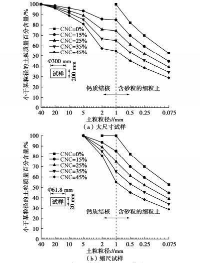 The samples of cohesive soil containing calcareous nodules (CSCN) with large and corresponding scale sizes have scale effects on the physical and mechanical properties such as compressibility, which are mainly affected by the calcareous nodule content (CNC) and the gradation composition. However, the current researches pay more attention to the influences of the gradation composition on the scale effects, while ignoring those of the CNC. The influences of the CNC on the scale effects of compressibility of the CSCN are discussed, and the relevant mechanism is revealed. The results show that the correlation between the scale effects of compressibility and the CNC is a step curve, which is mainly due to the fact that the calcareous nodules in the samples with the scale size are easier to form the skeleton effects under the same CNC. Based on this, considering the skeleton effects of calcareous nodules, a model for calculating the yield stress and compression index of samples is proposed to reduce the scale effects of samples. The proposed model may provide a new approach to obtain the compressibility parameters of samples with a large size by using the compression test results of samples with the corresponding scale size, which is reliable.