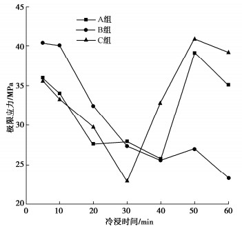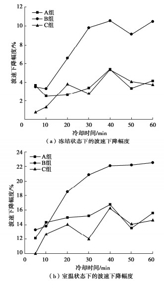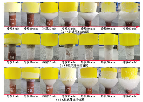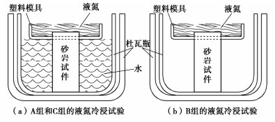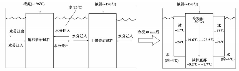 The construction of underground engineering often encounters the problems of staggered sand and soft strata with abundant groundwater. The low temperature of liquid nitrogen can make the rock and soil quickly freeze to achieve the purpose of soil stability and reinforcement. However, the rapid freezing of liquid nitrogen will also lead to the deterioration of the physical and mechanical properties of the surrounding rock and soil. Therefore, it is of great significance to explore the influence of external water source on rock deterioration under ultra-low temperature for the long-term stability and safety engineering construction. In order to study the influences of external water source on the low-temperature deterioration of rock, the ultrasonic experiment, nuclear magnetic resonance experiment and uniaxial compression experiment are carried out on rock samples under different saturated conditions after liquid nitrogen freezing treatment of liquid nigtrogen. The test results show that: (1) The rock samples still have damage in the frozen state, and the degree of damage increases further after the rock samples return to room temperature. (2) The freezing time of liquid nitrogen for about 40 minutes has the most obvious deterioration effects on the rock samples. (3) The external water environment increases the deterioration degree of the dry rock samples and decreases the deterioration degree of the saturated rock samples. (4) When there is a water source outside the rock, the long-term (> 30 minutes) freezing of liquid nitrogen will increase the strength of the rock, while the short-term (≤ 30 minutes) freezing of liquid nitrogen will deteriorate the strength of the rock.