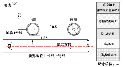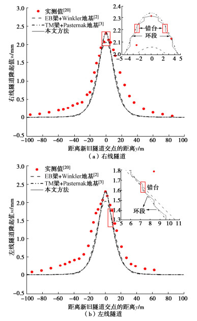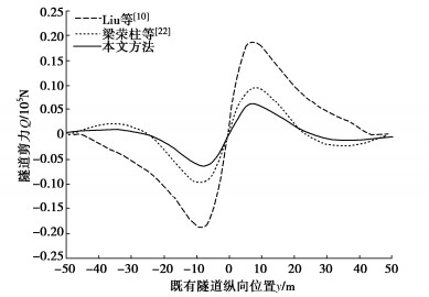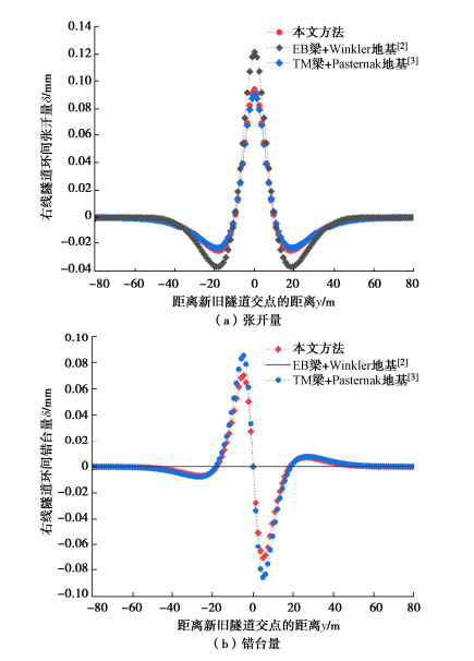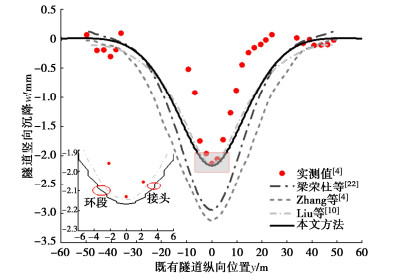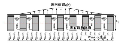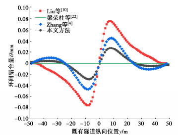 • 摘要: 为反映外荷载下盾构隧道相邻环间张开和错台,提出考虑环间接头影响的盾构隧道纵向变形简化解答。首先,引入纵向梁-弹簧模型模拟盾构隧道纵向受力变形,其中采用Timoshenko短梁考虑隧道环段变形,引入转动和剪切弹簧分别模拟环间接头转动与错台。其次,构建弹性地基上纵向梁-弹簧模型的有限差分方程,以解决环间接头-管环非连续变形求解问题,并推导外荷载下既有盾构隧道的纵向变形公式。最后,建立新建隧道上穿和下穿引起既有盾构隧道的纵向变形解答,并与新建隧道上、下穿越工程案例及现有理论方法对比验证。研究结果表明:所提方法预测的隧道位移与Timoshenko连续梁模型,协同变形模型和实测数据均具有较好的一致性,但所提方法得到的环间错台略低于Timoshenko梁模型和协同变形模型;所提方法可考虑环间接头的影响,得到的隧道位移曲线呈现既不光滑也不连续的特征,其中环段变形以刚体位移为主,而环间接头主要发生转动和错台;而基于现有理论所得盾构隧道纵向位移均为连续曲线,无法反映环间接头的真实转动与错台位移。