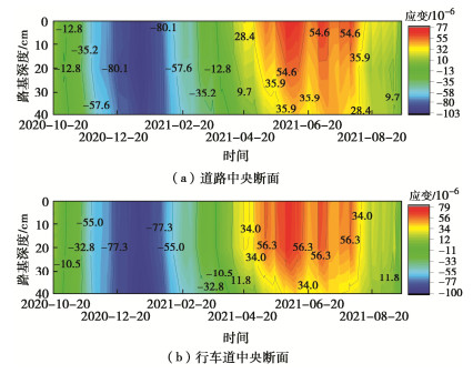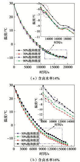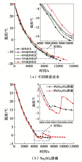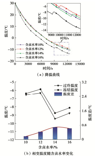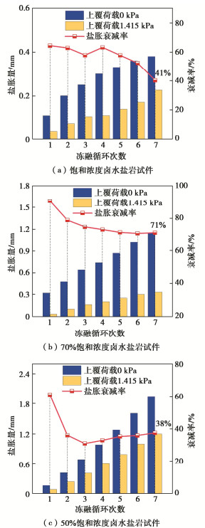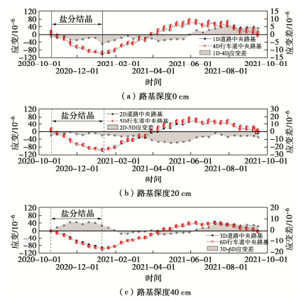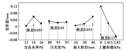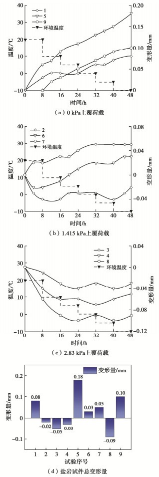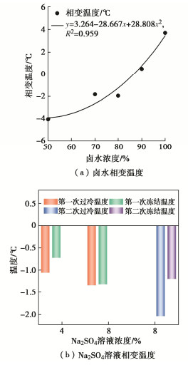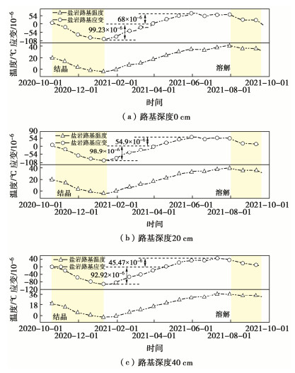 To investigate the deformation characteristics of salt rock subgrade filler under the influences of temperature, ensure the stability of salt rock subgrade and promote the resource application of salt rock in subgrade engineering, the characteristics of phase transformation in brine and salt rock are analyzed. An orthogonal test method is used to investigate the deformation of salt rock filler under the interaction of multiple factors in a single cooling condition. The salt expansion accumulation laws of salt rock filler after multiple freeze-thaw cycles are studied. Based on the test section field monitoring, the deformation characteristics of salt rock subgrade in salt lake area are evaluated. The results show that the cooling curves of different brine concentrations do not exhibit any obvious subcooling stage, their balance and fluctuation are very short, and the brine phase transition temperature increases with the increasing concentration. The cooling curve of salt rock filler has an obvious stage of subcooling and temperature jump, and the phase transition temperature decreases with the increase of the mixed brine concentration. The deformation of salt rock filler under single cooling condition ranges from -0.09 mm to 0.18 mm. The order of influences of various factors on the deformation of salt rock filler is as follows: overburden load > brine content > maximum particle size > compaction. The lower the concentration of mixed brine under the freeze-thaw cycle, the greater the salt expansion of salt rock filler. The overburden load has a strong effect on inhibiting salt swelling of salt rock fillers. The field monitoring of the entity engineering shows that with the growth of monitoring time, the deformation of the salt rock subgrade shows a sinusoidal cyclical variation and decreases along the depth direction, and it has a strong linear correlation with temperature.