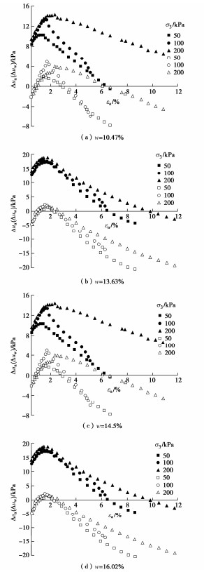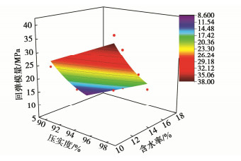 3, the water contents of 10.47%, 13.63% and 16.02 %, the confining pressures and the deviatoric stresses of 100 and 200 kPa. The 6-level stress loading and unloading method is adopted, and each sample is subjected to 2 loading and unloading cycles under undrained and unvented shearing. The results show that the optimum water content is the critical value at the turning point of internal friction angle, cohesion and strength of soil. The strength of the dilatancy greatly relates with the confining pressure and the water content. With the increase of the confining pressure and the water content, the dilatancy gradually decreases. With the progress of shearing, the pore water pressure and pore gas pressure both increase first and then decrease, and with the occurrence of shear dilatation. The curves of the pore gas pressure and the pore water pressure are gradually separated, and the matrix suction increases. Under the same water content, the greater the net confining pressure, the greater the pore gas pressure and the pore water pressure. Through the data analysis, the multivariate nonlinear function expression for the water content, the compaction degree and the resilience modulus is established. The significance of the influences of the water content and the compaction degree on the resilience modulus is analyzed. The influences of the water content on the resilience modulus much greater than those of the compaction degree. The research results may provide a useful reference for the design and construction of the related highways.