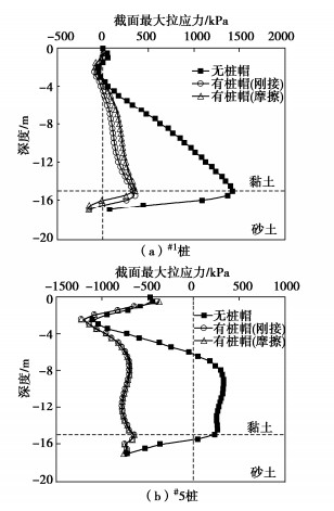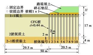 • 摘要: 刚性桩复合地基设计桩帽可避免桩顶部应力集中,更好的发挥复合地基性能,在工程实践中得到了广泛应用,然而桩帽存在对刚性桩复合地基支承路堤稳定性和渐进破坏特性的影响分析相对缺乏。建立精确化模拟桩帽刚性桩破坏后性状的有限差分数值模型,分析了桩帽对路堤荷载下桩体受力和破坏模式的影响,对比了不同桩帽尺寸对路堤稳定性的影响。结果显示,桩帽存在显著降低路堤下桩体承担的拉应力及弯矩,其临界破坏模式是弯曲破坏,相比于无桩帽情况,其连续破坏特性更为显著;增大桩帽尺寸可以有效降低桩体承担荷载,提高路堤稳定性,但存在桩帽发生破坏的风险,因此在设计时需对桩帽承载能力进行验算。