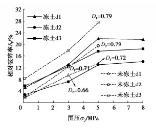 • 摘要: 针对三种不同粒径的单粒组冻结砂土开展三轴剪切试验,重点研究剪切过程中冻结砂土颗粒破碎演化规律及粒径对冻土颗粒破碎的影响。结果表明:冻结温度为-1℃和-2℃时,围压 \sigma _3 ≥5 MPa情况下冻结砂土出现明显压融,并且在-1℃时由于局部快速压融导致冻结砂土出现抗剪强度低于未冻土现象;冻结砂土在剪切过程中出现颗粒破碎现象,颗粒破碎率随轴向应变增大持续增长,在高围压( \sigma _3 ≥5 MPa)下甚至出现加速增长趋势;冻结砂土颗粒破碎率规律与未冻砂土不同,小粒组冻结砂土颗粒破碎率最大,该现象可能与冻土内部不同部位的冰晶作用有关。