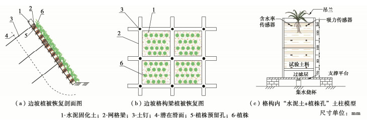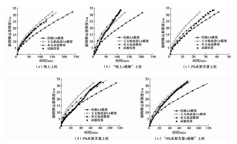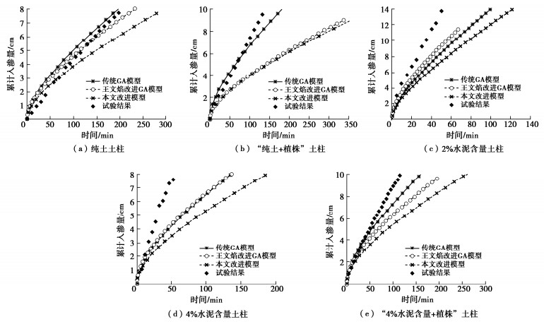 Prediction of rainfall infiltration in vegetation restoration of slopes is particularly important. In order to explore the rainfall infiltration process of filling soil in rock-desertificated slopes lattice, the rainfall infiltration modeling of five groups of composite soil columns is conducted, including pure soil, pure soil plus plant hole, soil with cement contellt of 2 %, soil with cement content of 4%, and soil with cement content of 4% plus plant hole. The traditional Green-Ampt infiltration model is too simplified, which divides the rainfall infiltration of soil column into saturated zone and dry zone. Therefore based on the layered soil assumption, the Green-Ampt infiltration model is improved, and the rainfall infiltration of soil column is divided into saturated zone, transitional zone and dry zone. The cumulative infiltration depth and cumulative infiltration amount of new vegetated cement soil with time are studied, and the improved model is verified by compariny with the test results. It is shown that the calculated values by the improved Green-Ampt model for wetting front migration depth are in good agreement with the measured ones, and the calculation accuracy is significantly improved. The improved Green-Ampt model can be used to analyze the cumulative infiltration (water-storage capacity) for the ecological restoration technology in vegetated cement soil in the rock-desertificated slope lattices, which is of a positive engineering practical value.