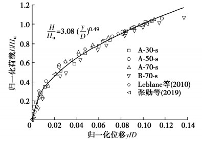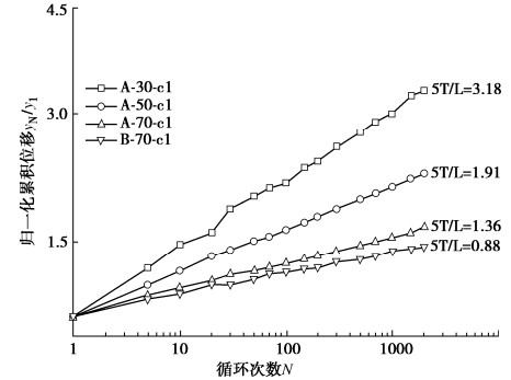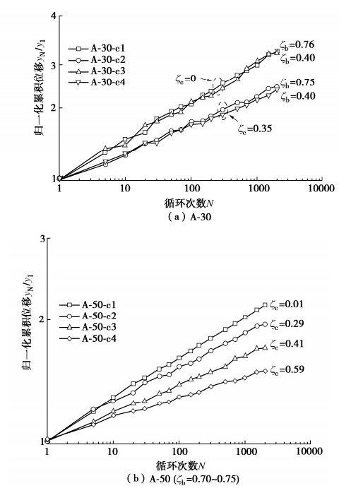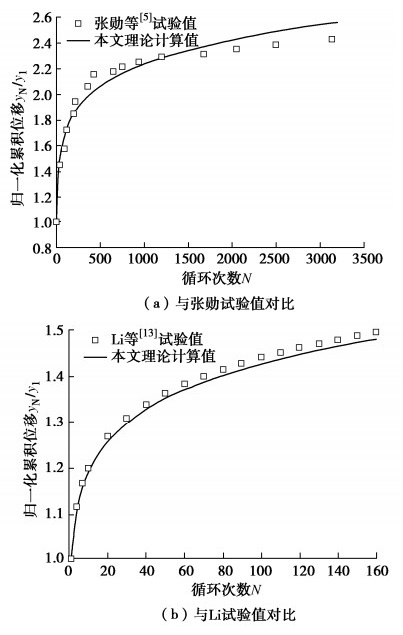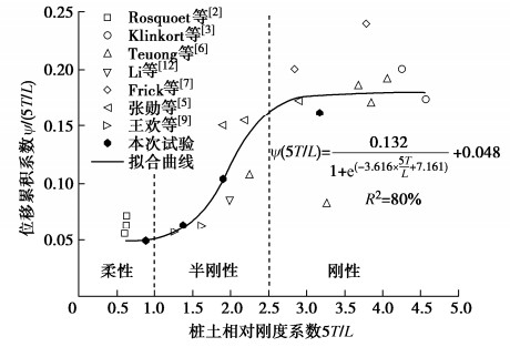 ζb. Also, the relationship between the pile-soil relative stiffness and the normalized cumulative deformation shows a "s" shape, that is, the pile-soil relative stiffness has small effects on the cumulative deformation of the flexible and rigid piles. But, the cumulative deformation of the semi-rigid pile increases with the increasing pile-soil relative stiffness. On this basis, the prediction model for the cyclic lateral cumulative deformation considering the combined effects of characteristics of cyclic loading and pile-soil relative stiffness is proposed. The rationality and reliability of this method are verified by comparing with the experimental data in the literatures.