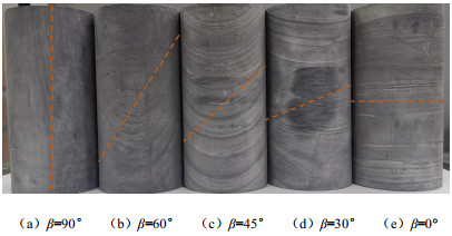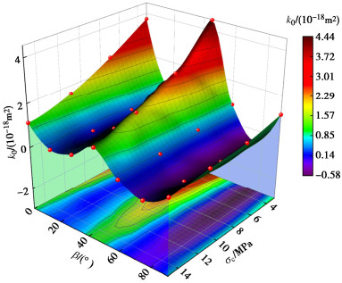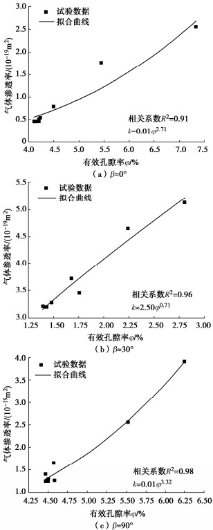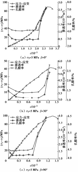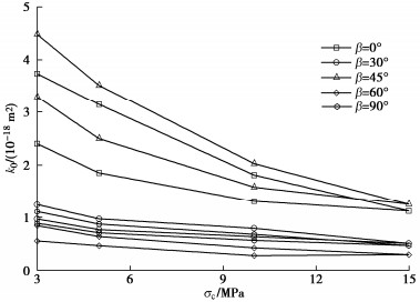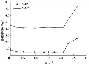 β=45°. During the confining pressure cyclic loading-unloading process, the gas permeability decreases with the loading of the confining pressure, then increases while unloading. The gas permeability detected during unloading is smaller than that during loading. An exponential relationship is observed between the effective porosity and the gas permeability of the layered phyllite. The gas permeability parallel to the bedding direction is much greater than that perpendicular to the bedding direction. The variation of the effective porosity and gas permeability with deviatoric stress undergoes initial consolidation stage linear elastic stage, and plastic deformation stage. With the increase of the deviatoric stress, the effective porosity and gas permeability of rock specimens decrease first, then keep stable, and finally increase rapidly, and reach the maximum when the slope of stress-strain curve is close to zero.
