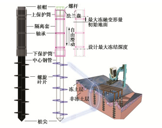 Based on the isolation helical piles designed to resist vertical loads and eliminate the effects of freeze-thaw of foundation, the characteristics of force evolution, load transfer, and foundation response of two typical types of helical piles (