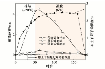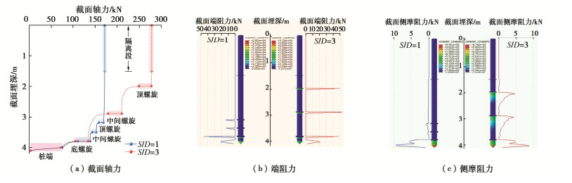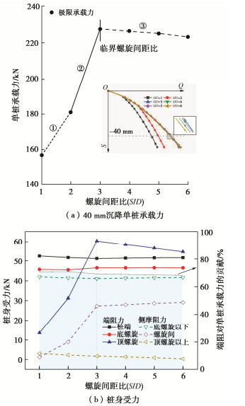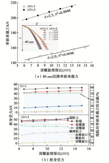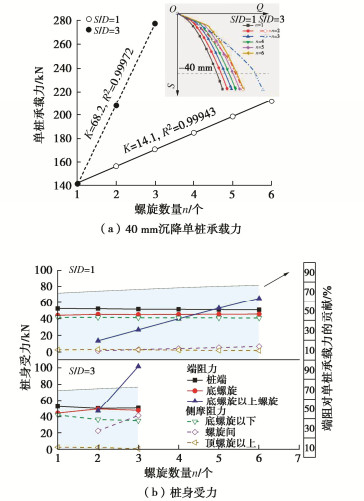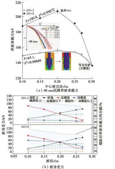 Dcr) during settlement, as well as the influences and mechanisms of pile geometries on the bearing capacity of the single pile are revealed from the perspective of pile force. Furthermore, the performance of the new piles against freeze-thaw deformation of foundation is examined. The results show that: (1) The bottom helixes and the lower pile bodies of the two typical piles share the same stress characteristics during the settlement, whereas the stress magnitude and evolution characteristics of end resistances of the remaining upper helixes and side friction resistances of inter-helixe piles differ significantly. (2) The end resistance of each helix of piles with