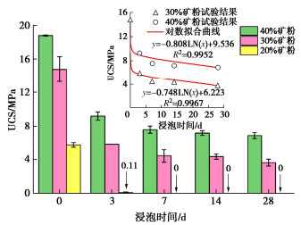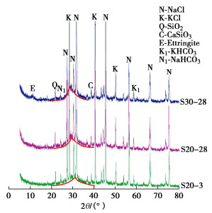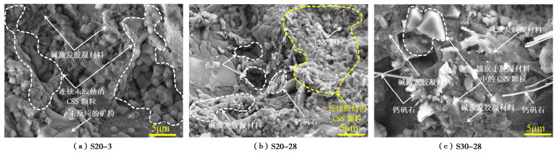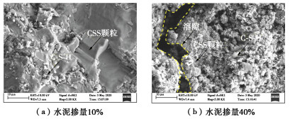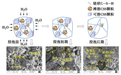 The concentrated solution sludge (CSS) produced by submerged combustion process on leachate has the characteristic of high soluble salt content. The sulfoaluminate cement (SAC) and alkali-activated GGBS geopolymer are used to solidify the CSS, respectively. A series of unconfined compressive strength (UCS) tests, water stability tests and microscopic observation tests are carried out on the solidified samples to investigate the curing effects and curing mechanisms of the SAC and alkali-activated GGBS geopolymer on the CSS. The results show that the UCS of the solidified sample with the SAC of 40% is 1.95 MPa at 28 d-curing age, and decreases to zero after 28 d-water immersion. The UCS of the solidified sample with the GGBS of 30% is 14.8 MPa at 28 d-curing age, and remains 3.6 MPa after 28 d-water immersion, which is much higher than the strength requirement of landfills. The three-dimensional geopolymeric gels and ettringite crystals produced by the GGBS geopolymerization are capable of effectively encapsulating and cementing the CSS particles, which is the curing mechanism of the alkali-activated GGBS-solidified CSS.
