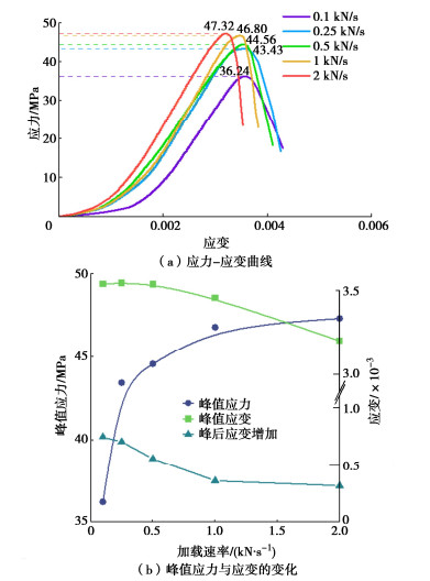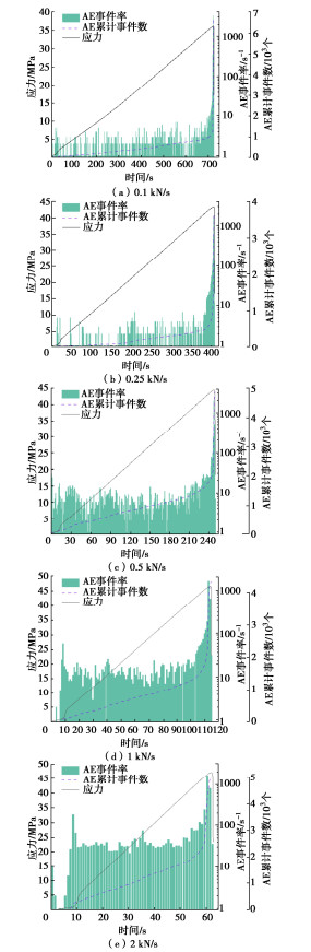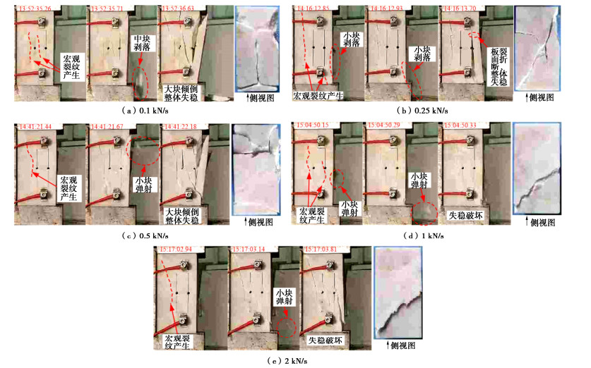 Excavation of deep brittle rock often leads to slab failure, and may further to flake spalling, rock explosion and other engineering disasters, which is a serious threat to the safety of construction of deeply buried tunnels. In deep rock mass engineering, the rate of stress redistribution after excavation varies due to the factors such as tectonic stress, excavation conditions and engineering disturbances. In order to investigate the effects of loading rates on the destabilization damage of slab-failure surrounding rock, the unilateral limit uniaxial compression tests are conducted using brittle rock processed into slab-failure specimens, and the macroscopic rupture, strength characteristics, acoustic emission (AE) characteristics and energy mechanism of the specimens are comprehensively investigated under different loading rates. The results show that: (1) The specimens exhibit large pieces of spalling, overall instability and separation under low loading rates. The specimens did not separate in large pieces under high loading rates, but there are small pieces of power ejection. The compressive strength of the specimens increases with the increase of the loading rates. (2) The increase of low frequency and high amplitude signals and the change of